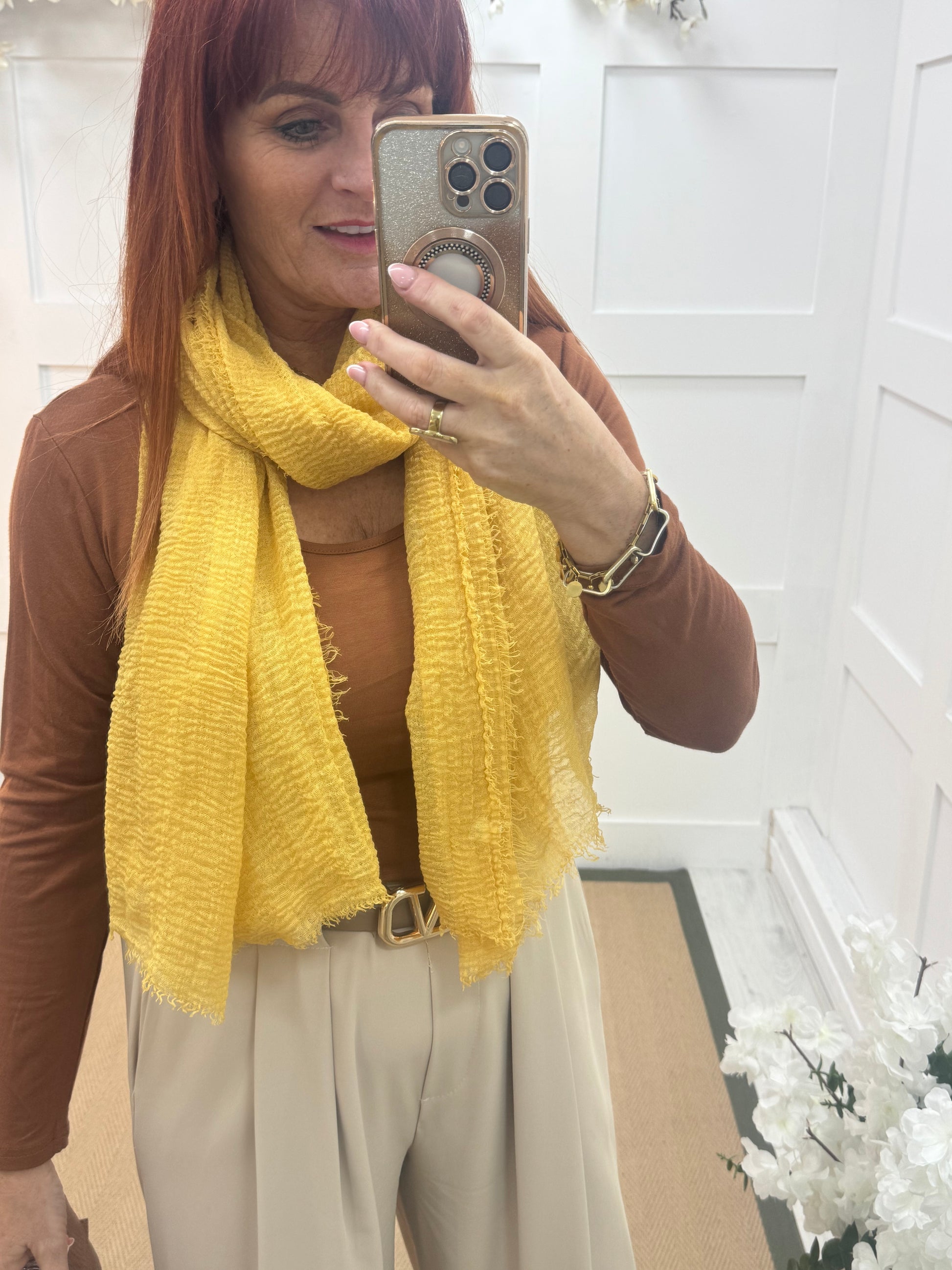 Tula: Yellow long frayed raw edge scarf. One size