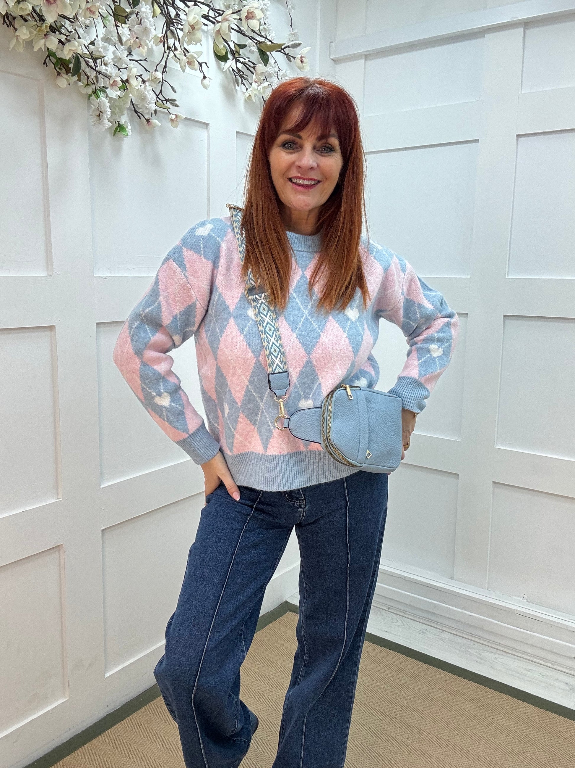 Allana: Baby blue & pink argyle knit top. One size: 10-18