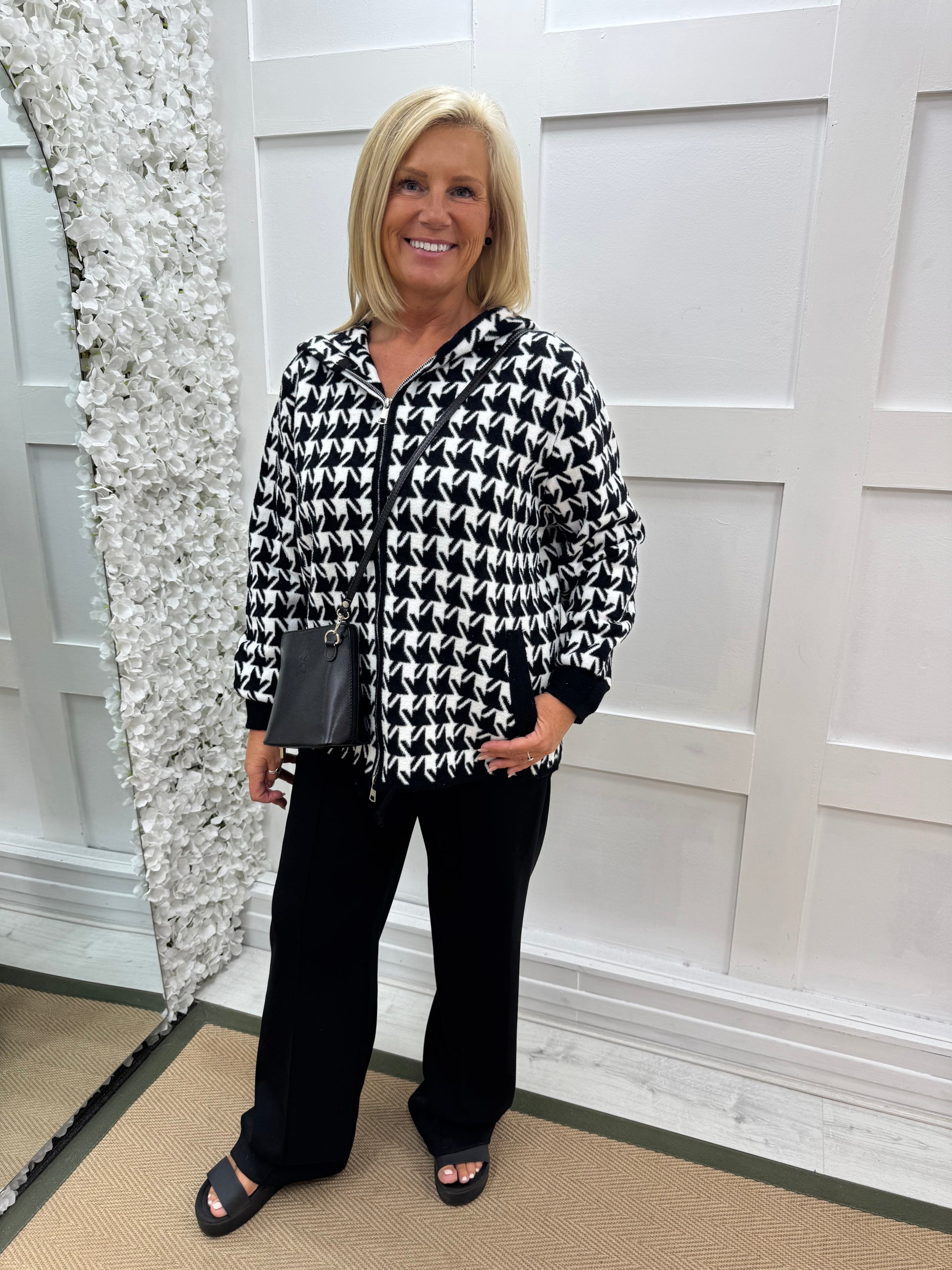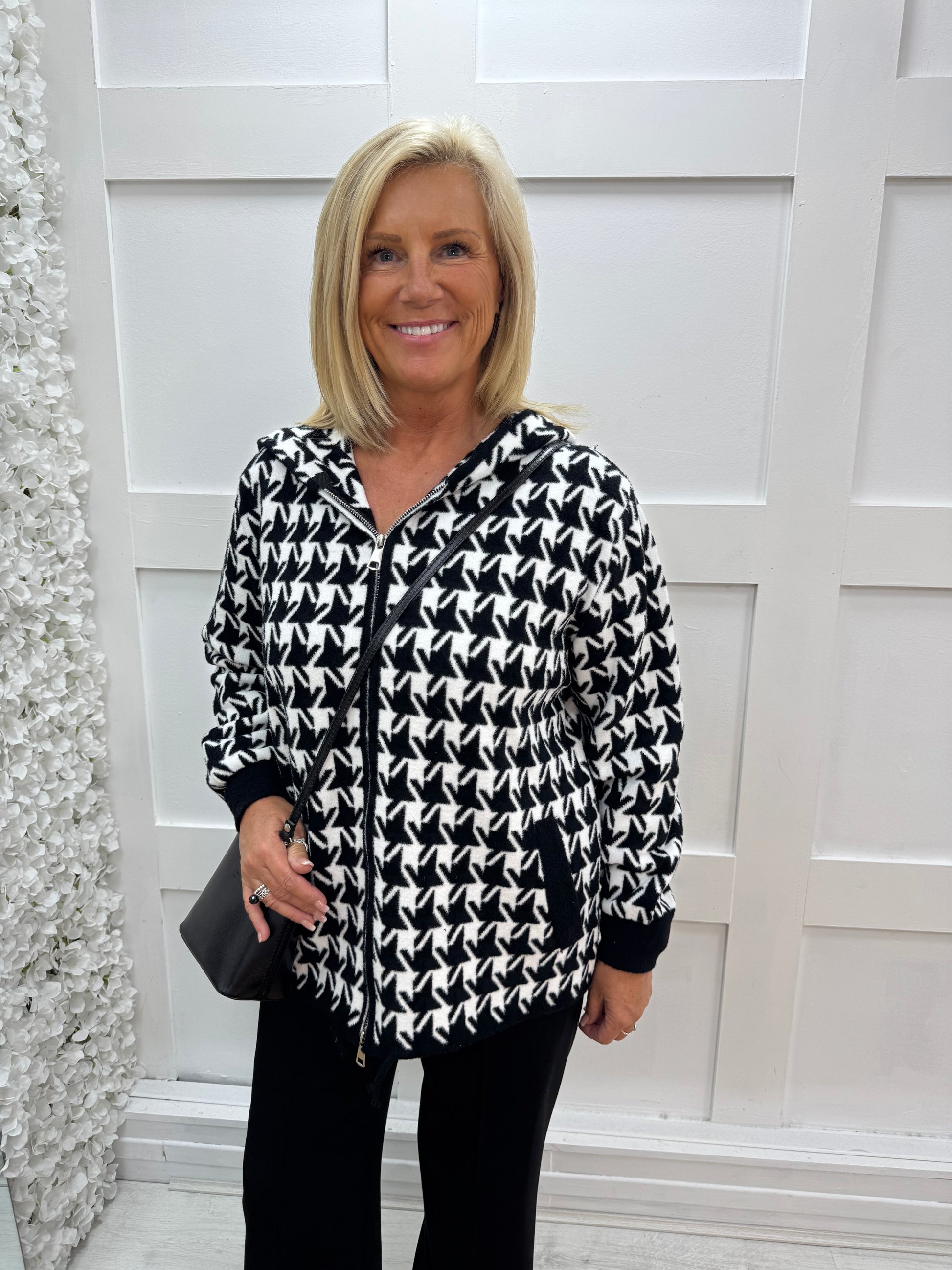 This stylish coatigan features a bold black-and-white houndstooth pattern in a heavy-weight knit for warmth and comfort. Designed with a practical hood and full front zip, it offers versatility and ease. Handy front pockets add function, while the chic design makes it perfect for layering in cooler weather.