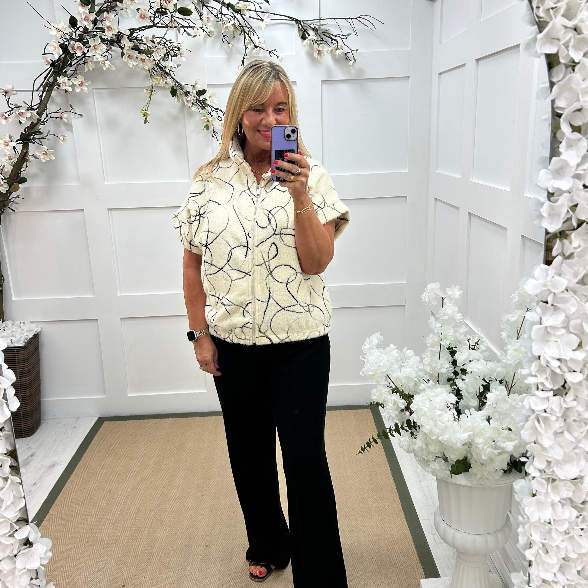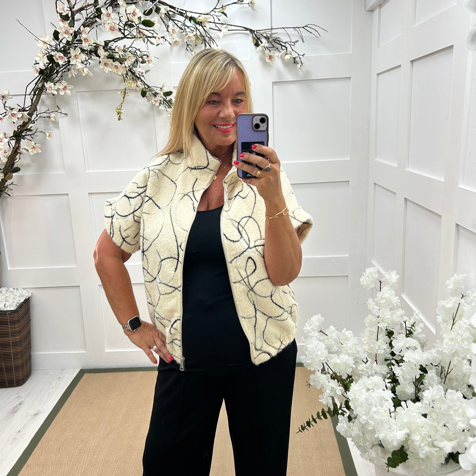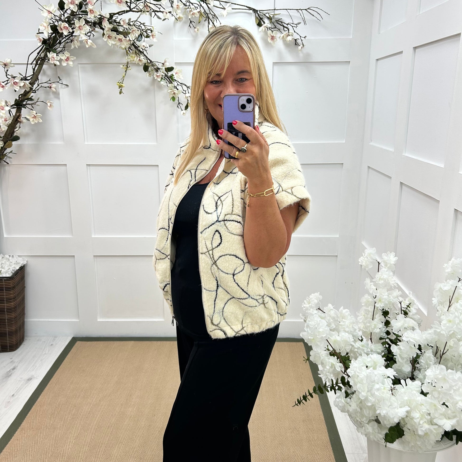 A unique cream wool gilet with a striking rope swirl print all over, the large collar has black fringing running around and down the front giving it a statement look. Team up with black Trudy trousers or Lorie leggings for a great style.