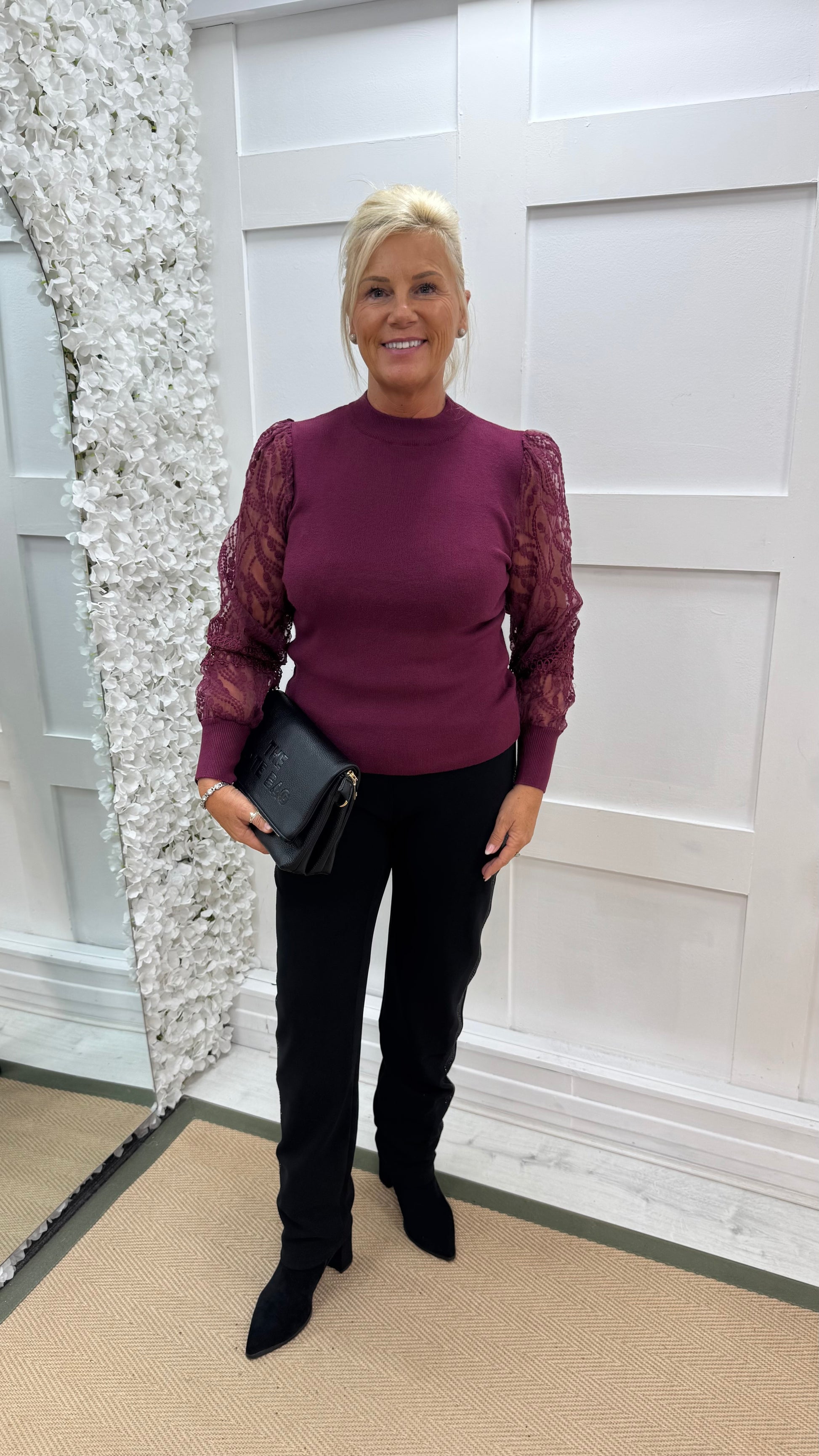 Alora: Burgundy crochet balloon sleeve top. 3 sizes.