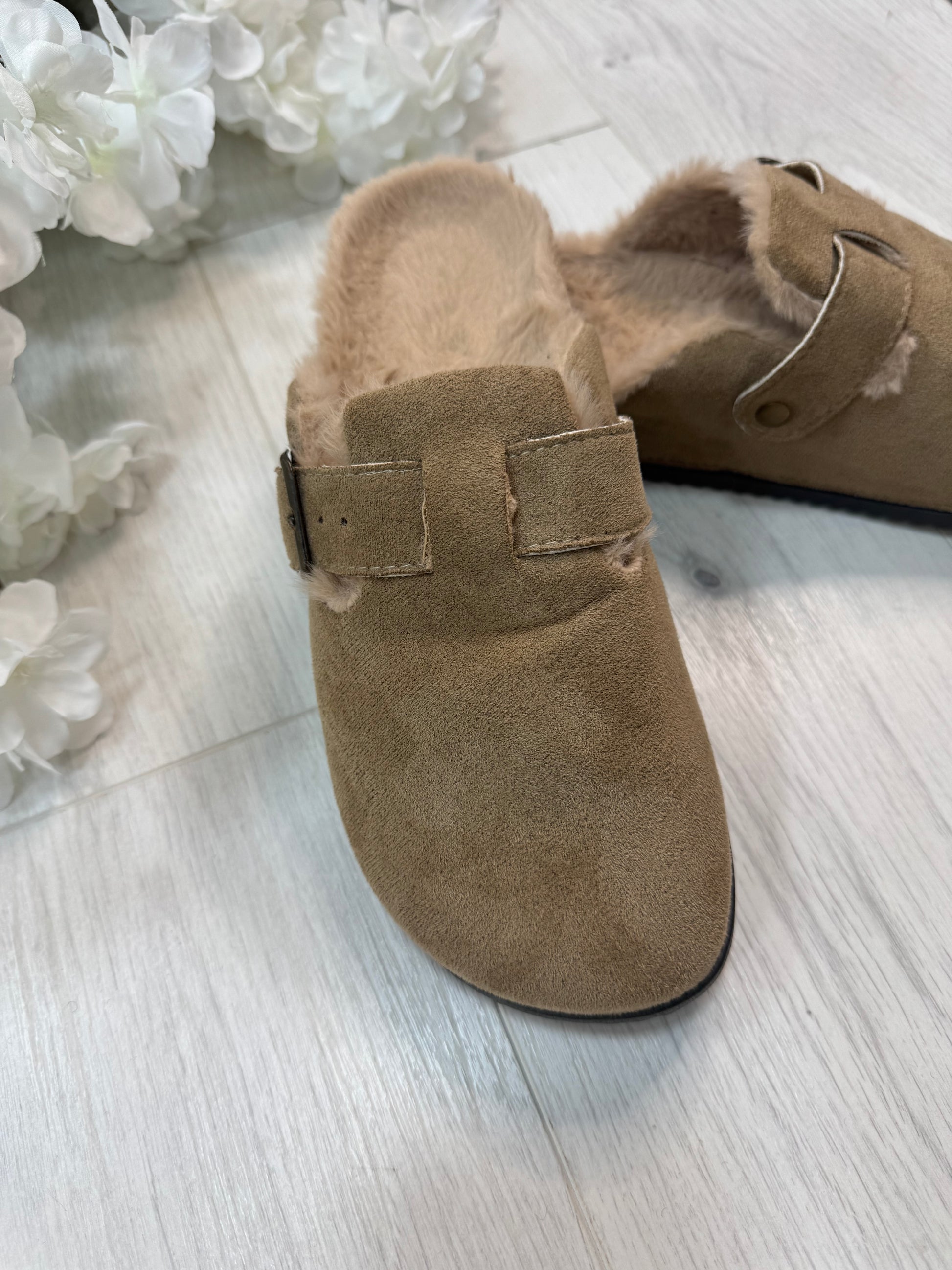 Amber: Beige faux fur sking back mule. Sizes: 3-8