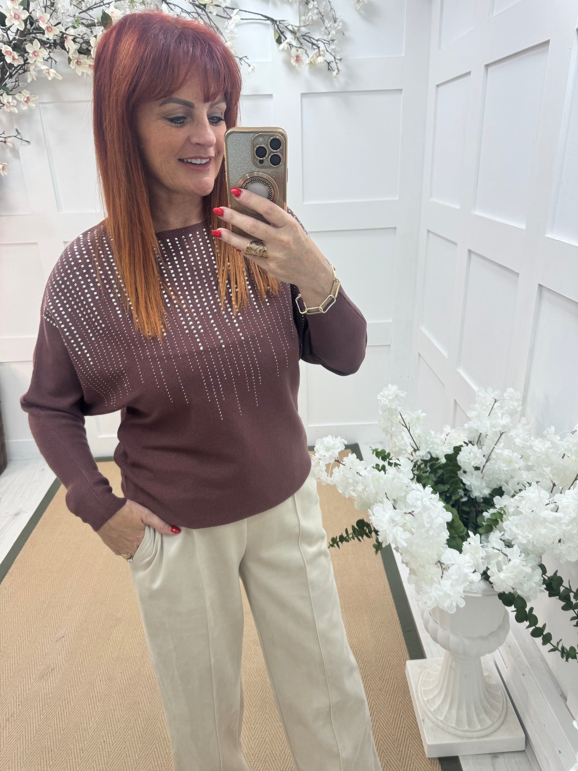 This soft, stretchy top combines comfort with subtle glamour. In brown , it features a flattering scoop neckline and long sleeves for easy wear. The standout detail is the shimmering embellishment across the chest. Effortlessly chic, it transitions from day to evening with ease. Perfect to pair with our Trudy trousers.