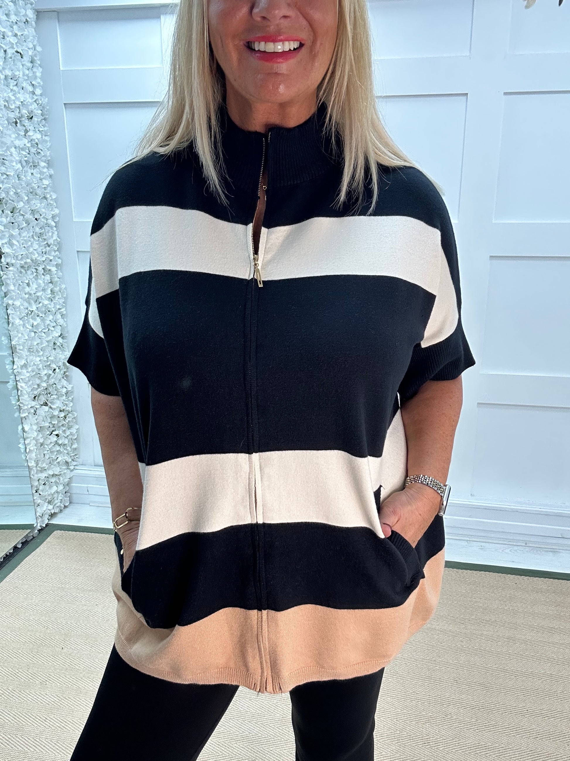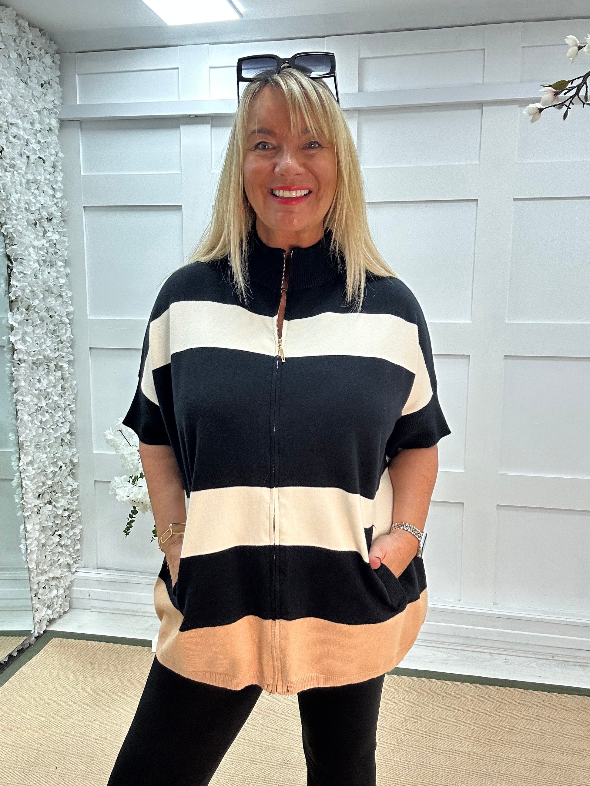This cardigan features a bold, oversized geometric colour-block pattern in camel, black, and cream tones. The loose, draped fit with the gold zip detailing provides comfort and effortless style, perfect for layering. With a soft knit texture and modern design, it combines casual elegance with a contemporary, high-fashion edge suitable for any chic wardrobe.