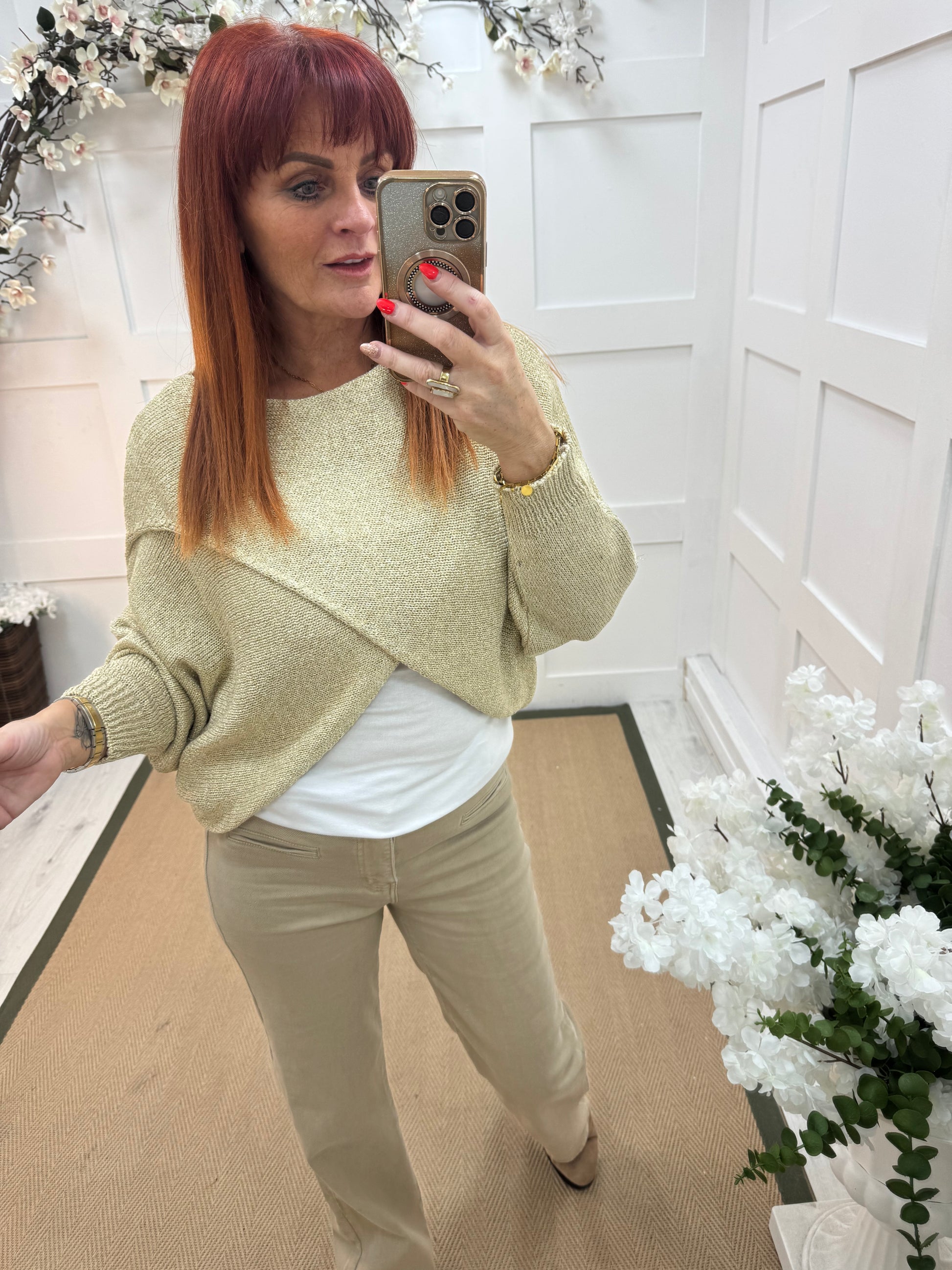 A dazzling stretchy gold lurex knitted top with a flattering shrug style wrap-over design. Its shimmering fabric catches the light beautifully, adding a touch of glamour. Soft and comfortable with a figure-hugging fit, this versatile piece is perfect for layering or wearing alone for an effortlessly chic statement look.