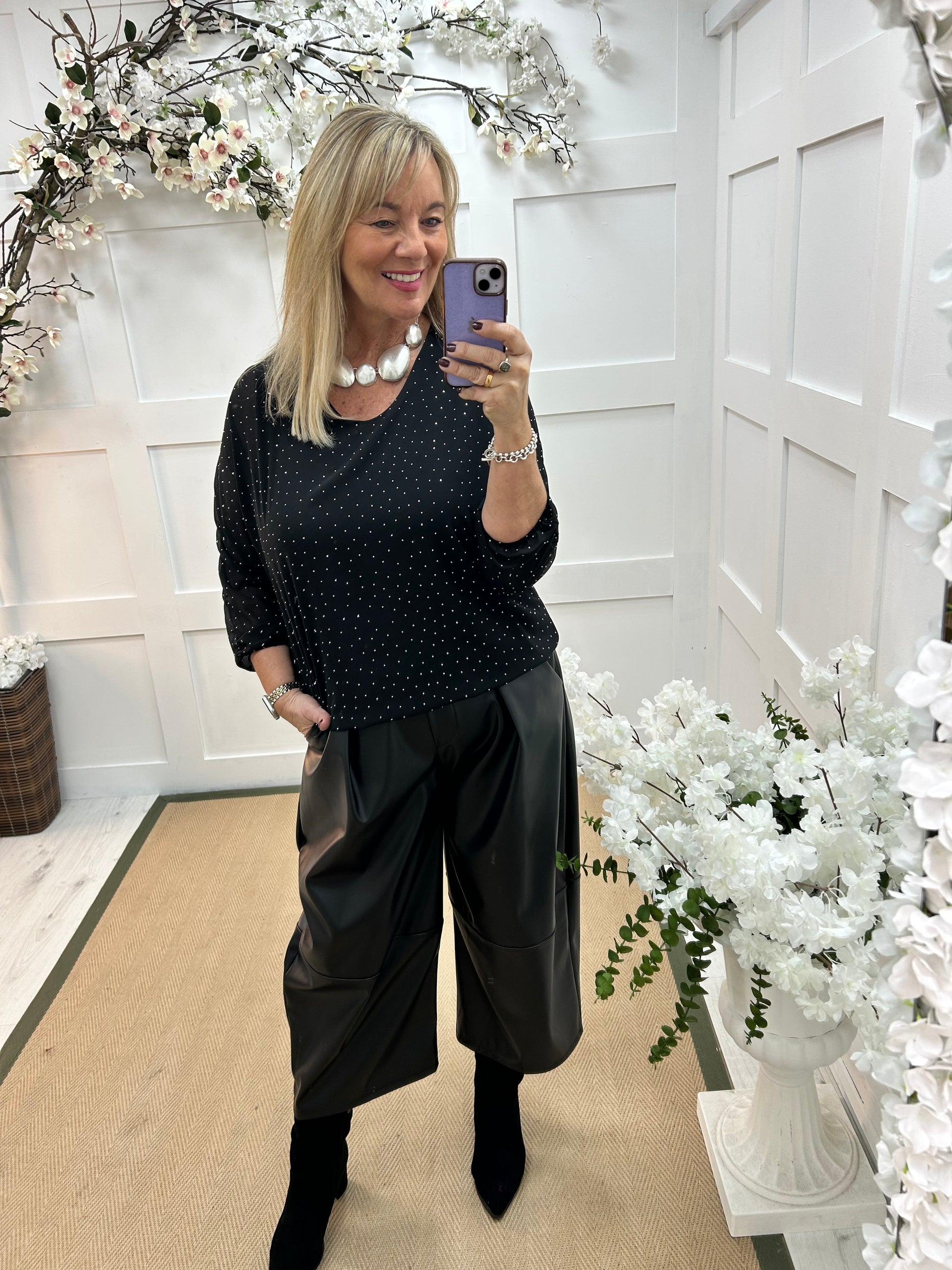 A shimmering silver diamanté V-neck blouse that sparkles from every angle. Designed with an all-over rhinestone finish, it features an elasticated bubble hemline that flatters the waist. Light, eye-catching, and effortlessly glam, this party-ready top adds instant dazzle to any evening outfit. Perfect for festive nights out.