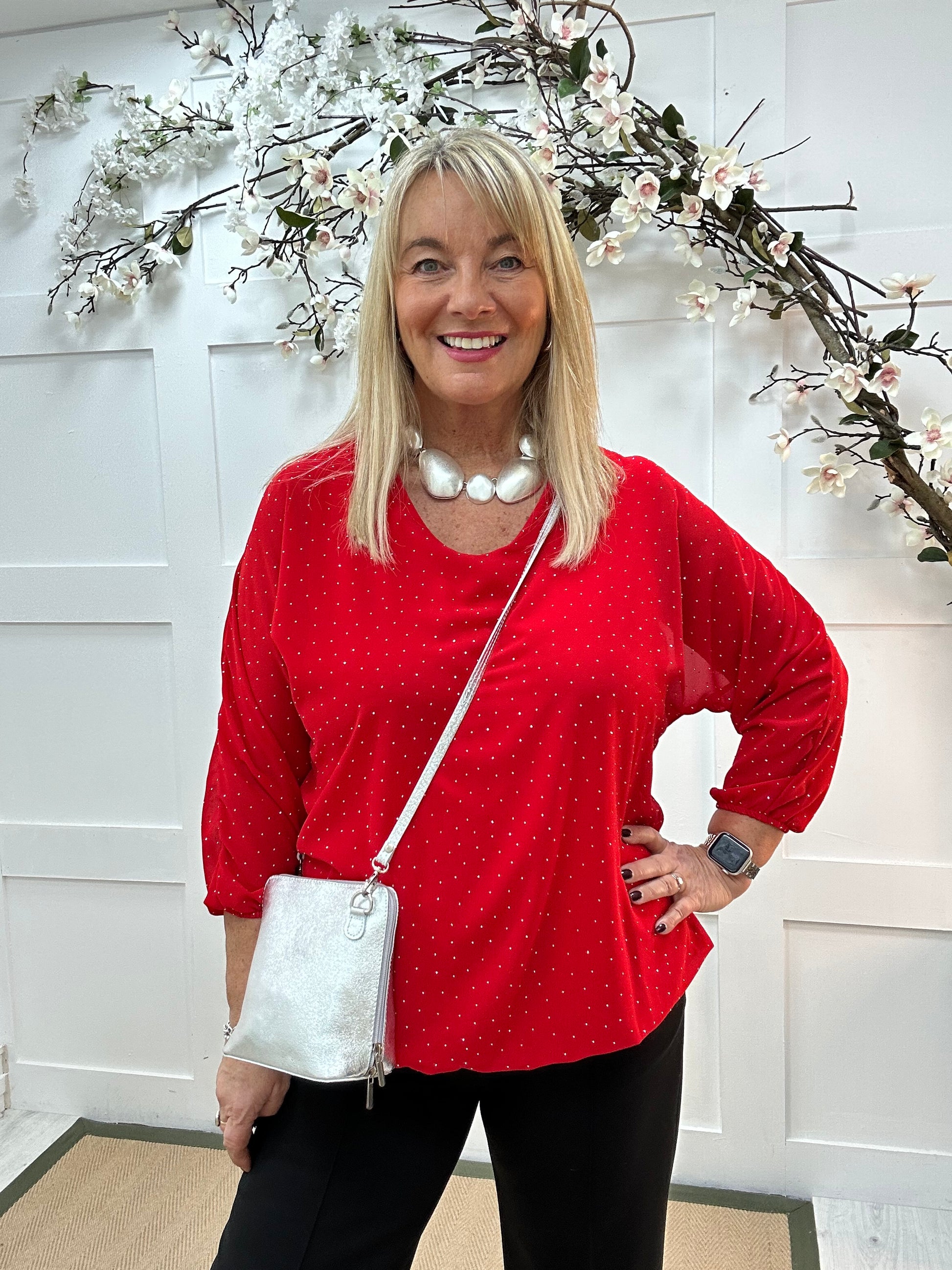 A shimmering silver diamanté V-neck blouse that sparkles from every angle. Designed with an all-over rhinestone finish, it features an elasticated bubble hemline that flatters the waist. Light, eye-catching, and effortlessly glam, this party-ready top adds instant dazzle to any evening outfit. Perfect for festive nights out.
