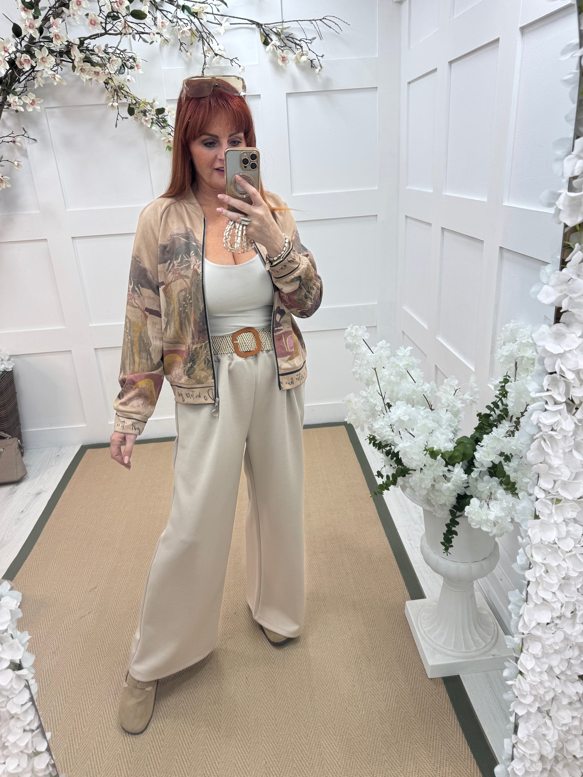 Our stylish zip-up autumn weight jacket features a soft sand & khaki base with an autumnal print. It has a li, mid weight soft feel fabric, ribbed cuffs and Italian scripted hem, and voluminous sleeves for a feminine, relaxed silhouette—perfect for effortless layering.