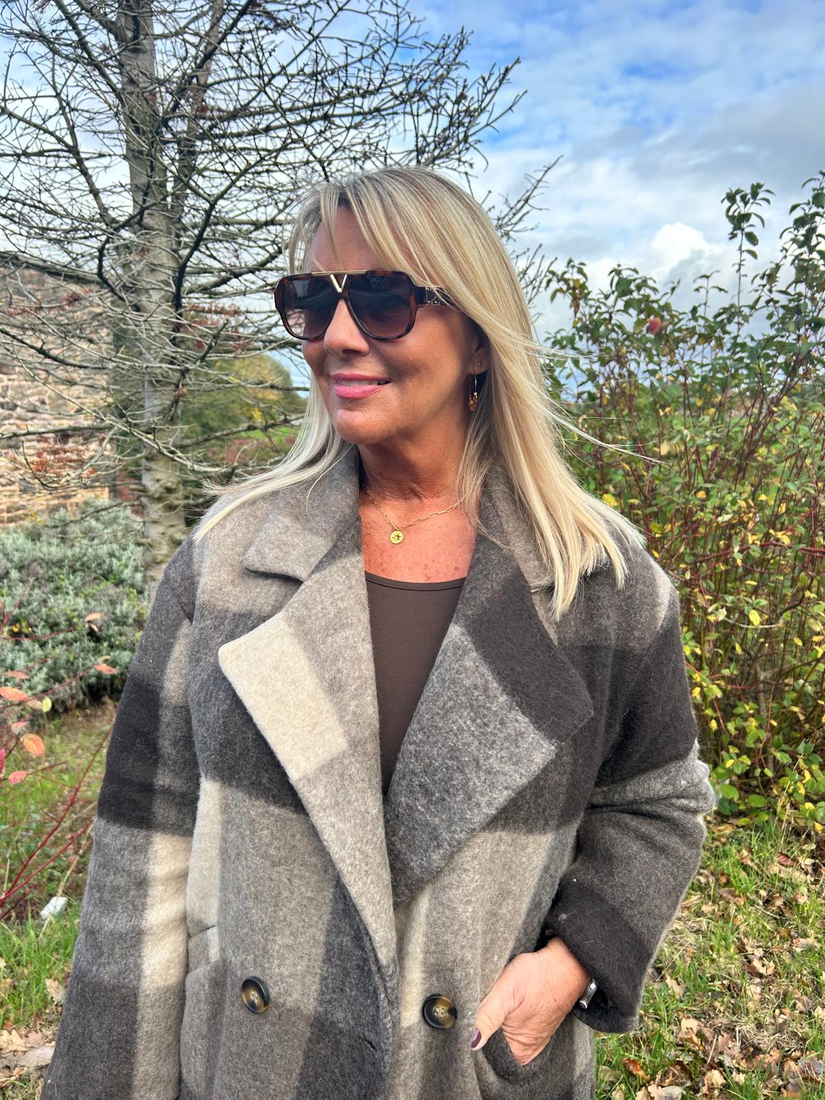 This statement Made in Italy coat features a bold oversized check design, relaxed fit, and a double-breasted front with large buttons. It has dropped shoulders, wide lapels, and deep side pockets for a casual yet sophisticated silhouette. The soft, brushed texture adds warmth and comfort, making it the perfect standout piece for chilly days