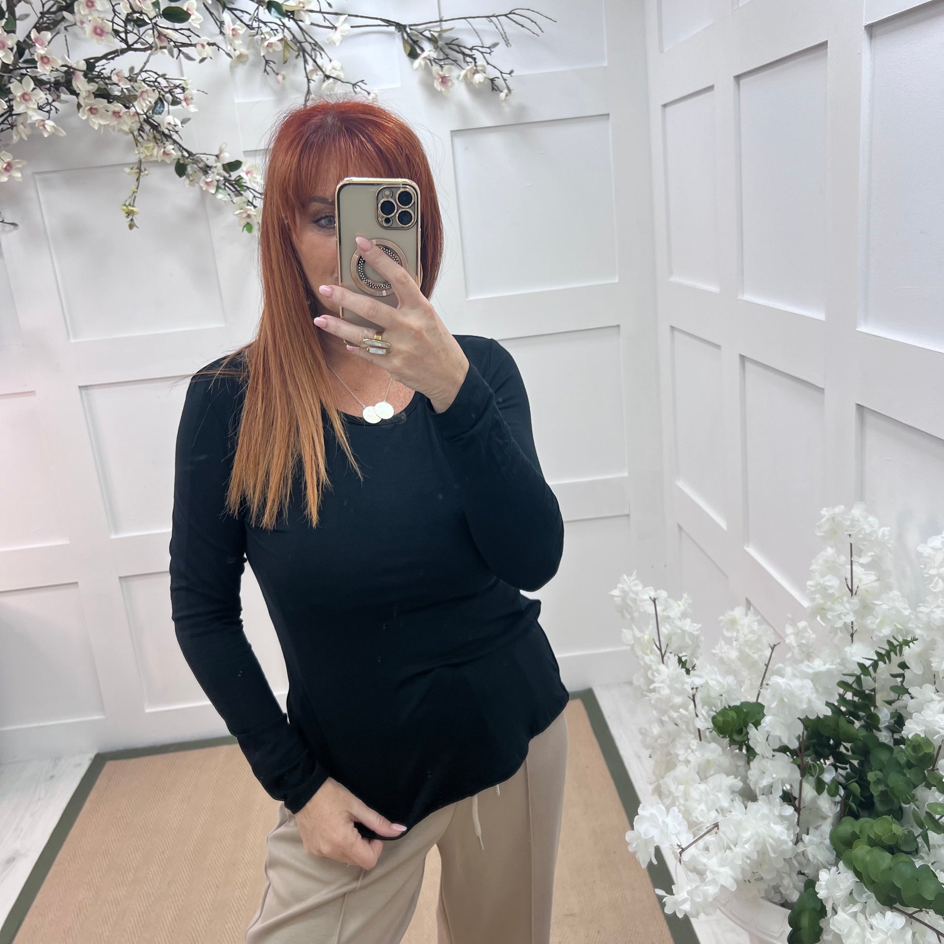 Bessie: Black basic long sleeve top. One size: 10-16/18