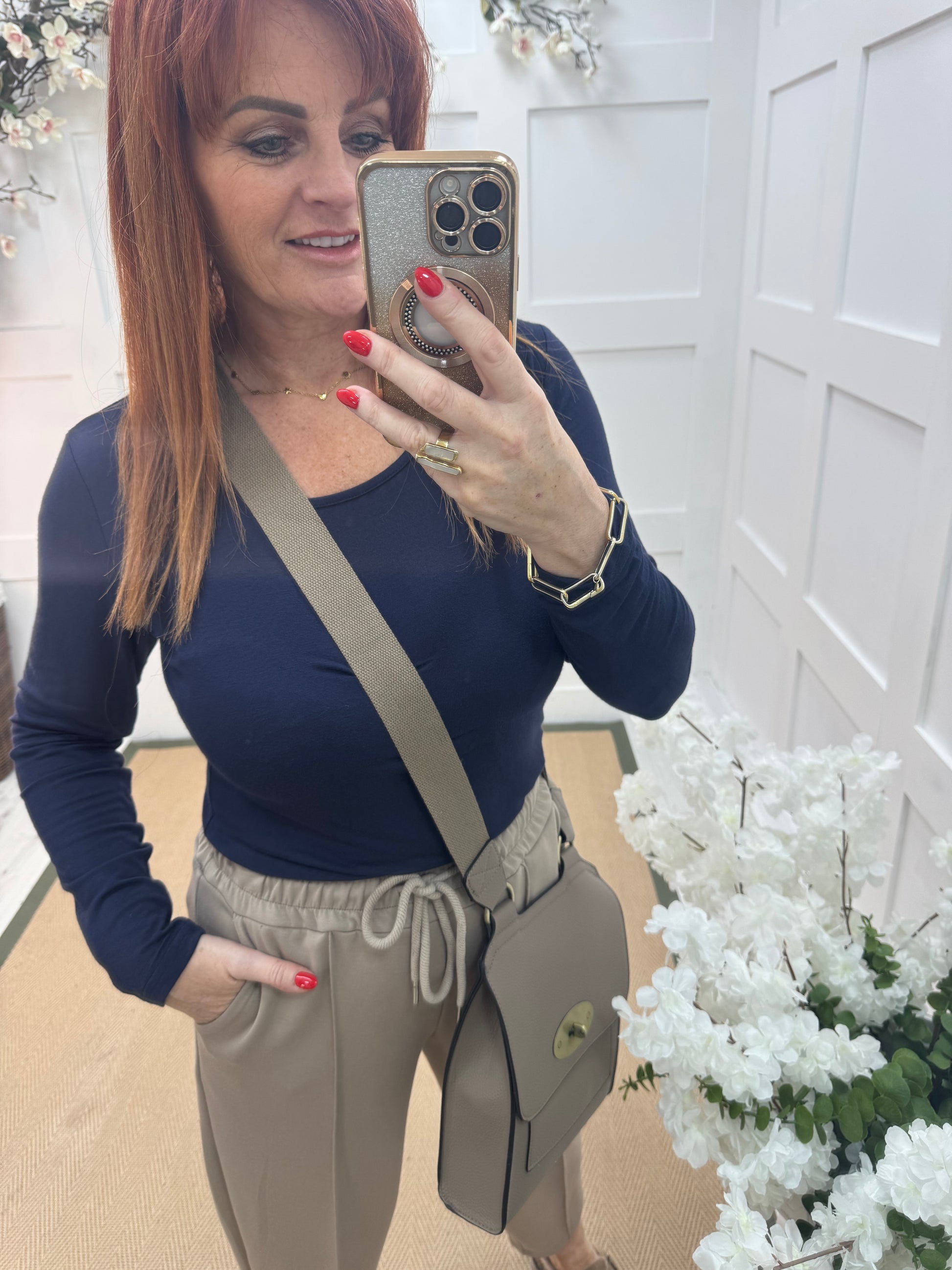 Bessie: Navy basic long sleeve top. One size: 10-16/18
