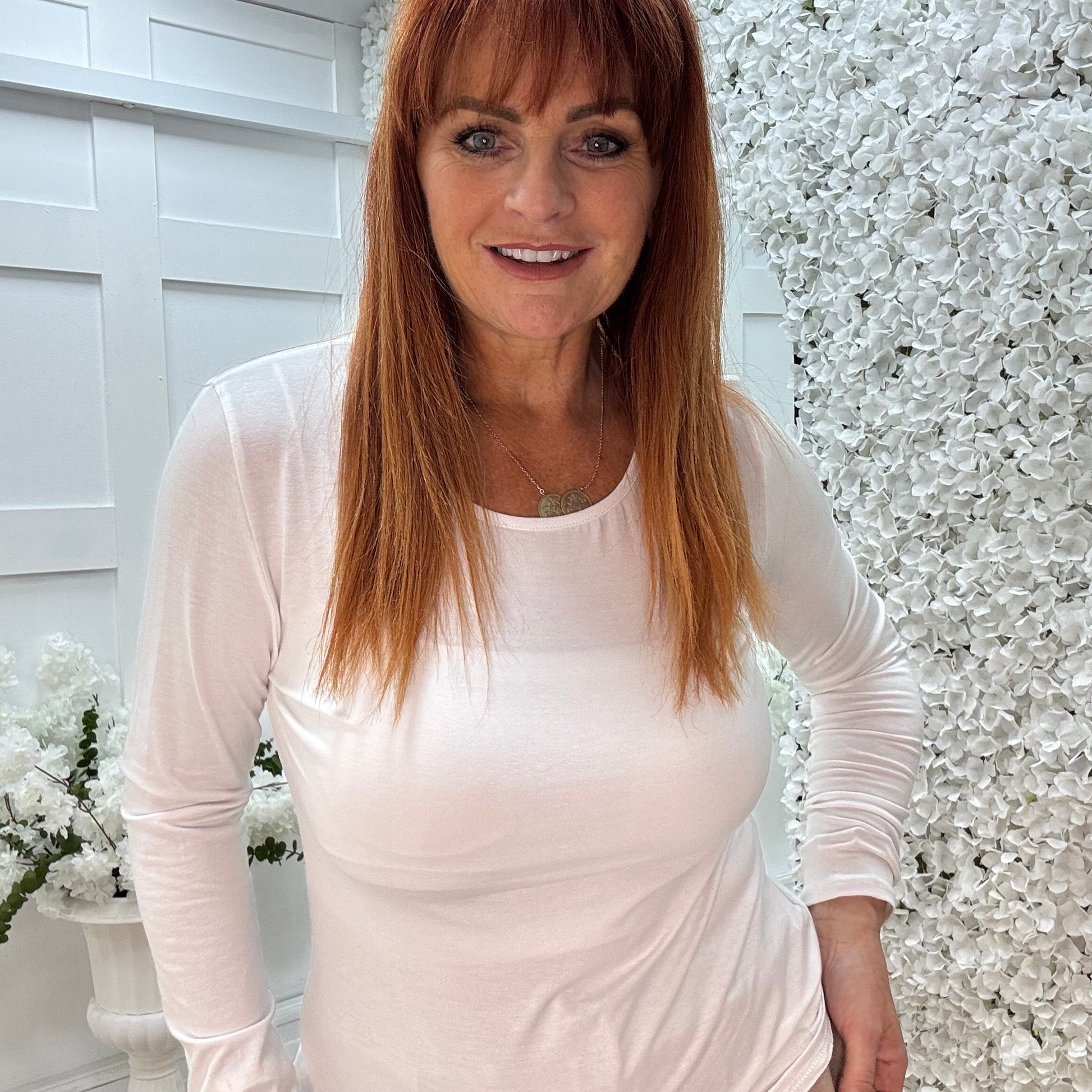 Bessie: White basic long sleeve top. One size: 10-16/18