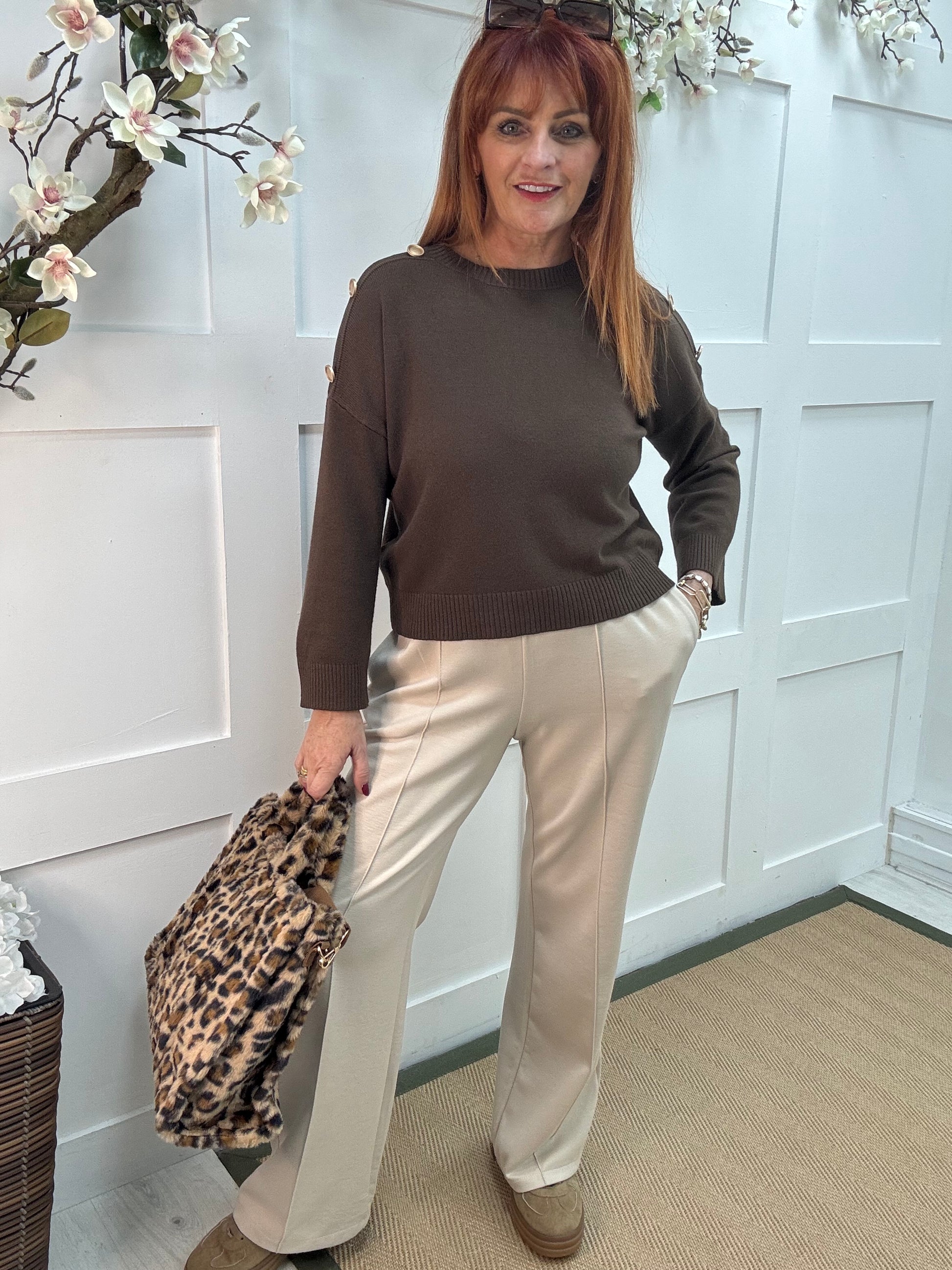 Lorna: Brown gold button knitted top. One Sz: 10-16
