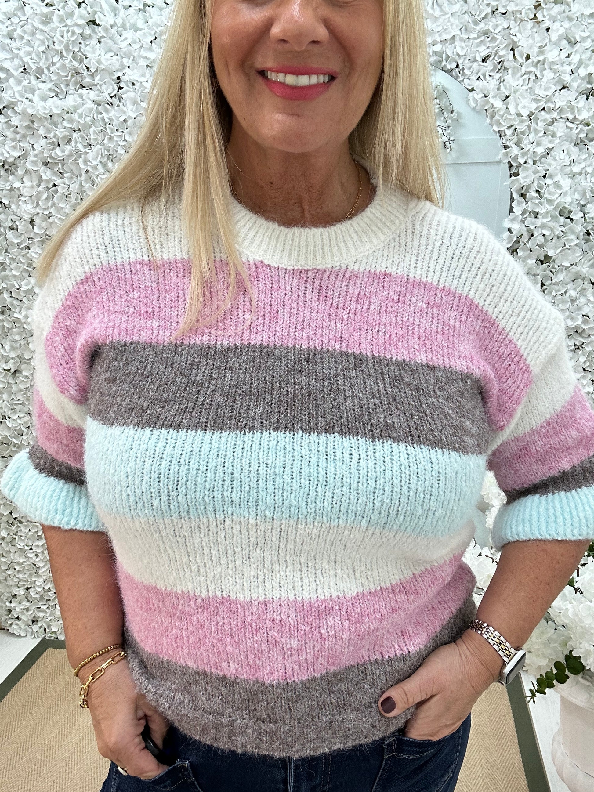 This relaxed fit striped knit features a flattering neckline and 3/4 ruffle sleeves. Its cream base is highlighted by a gentle pink, brown and baby blue stripe creating a stylish contrast. Falling loosely over the hips, it offers effortless comfort and chic for everyday wear. Can be paired with our Trudy trousers.
