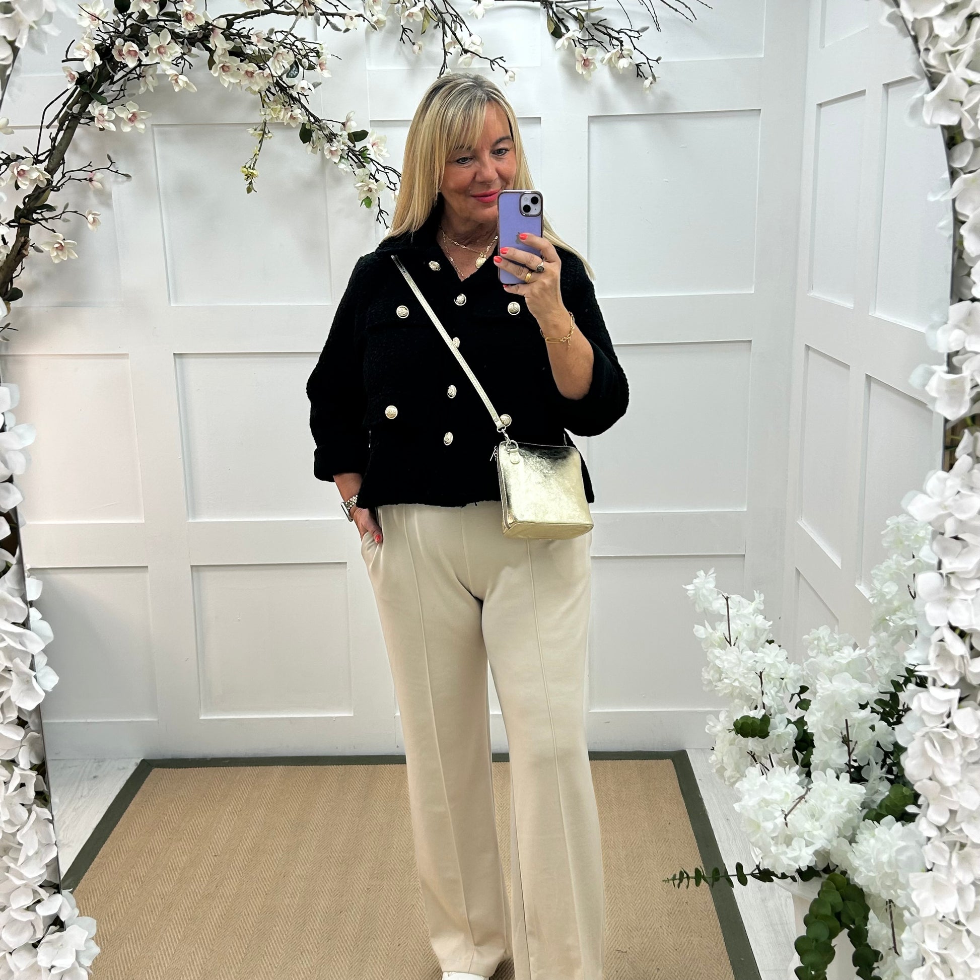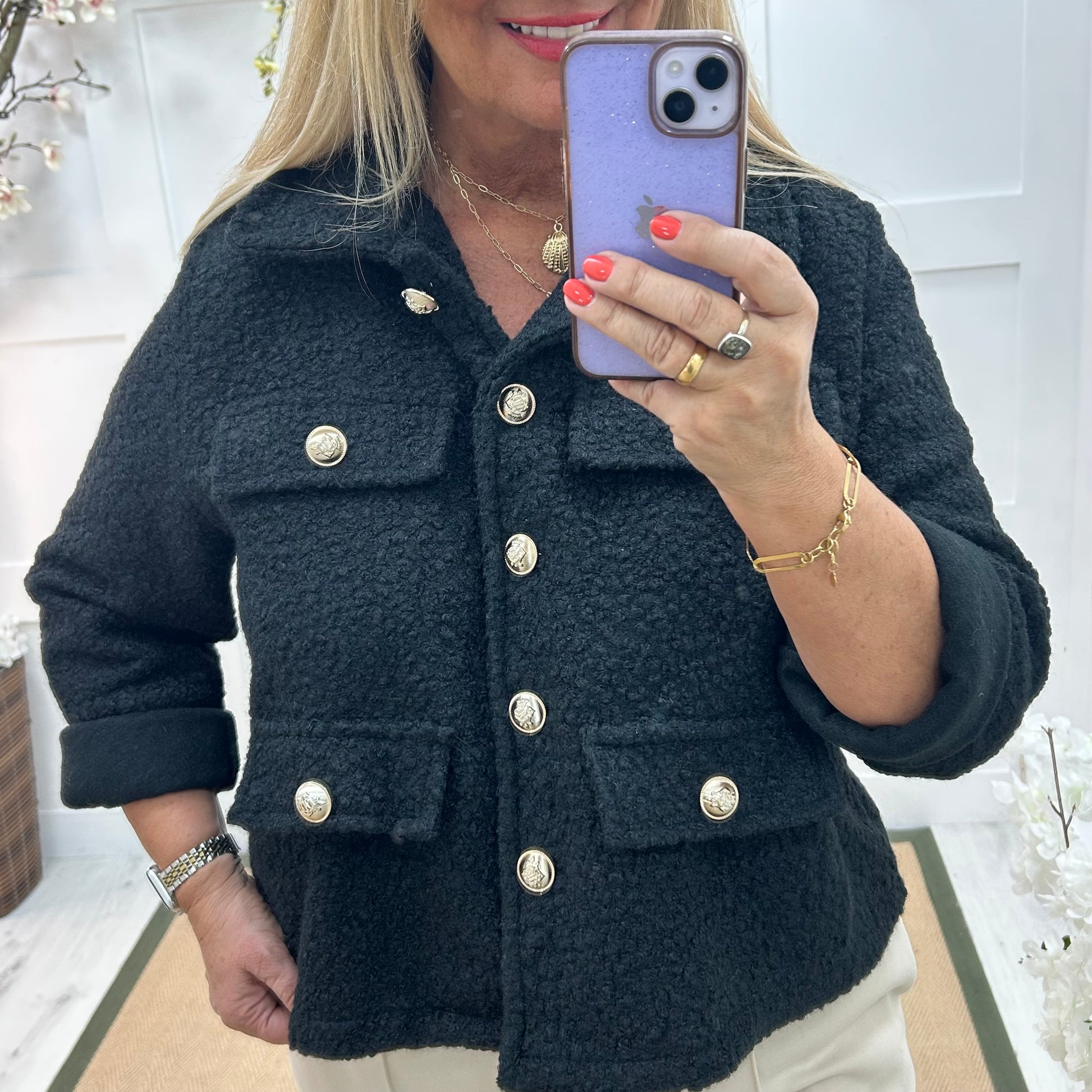 This Italian-made short boucle knit jacket exudes timeless elegance. Featuring a chic cropped cut, it fastens with gleaming gold buttons for a touch of luxury. Designed with four stylish faux pockets and long sleeves, it balances sophistication with versatility. A polished layering piece that transitions effortlessly from day to evening.