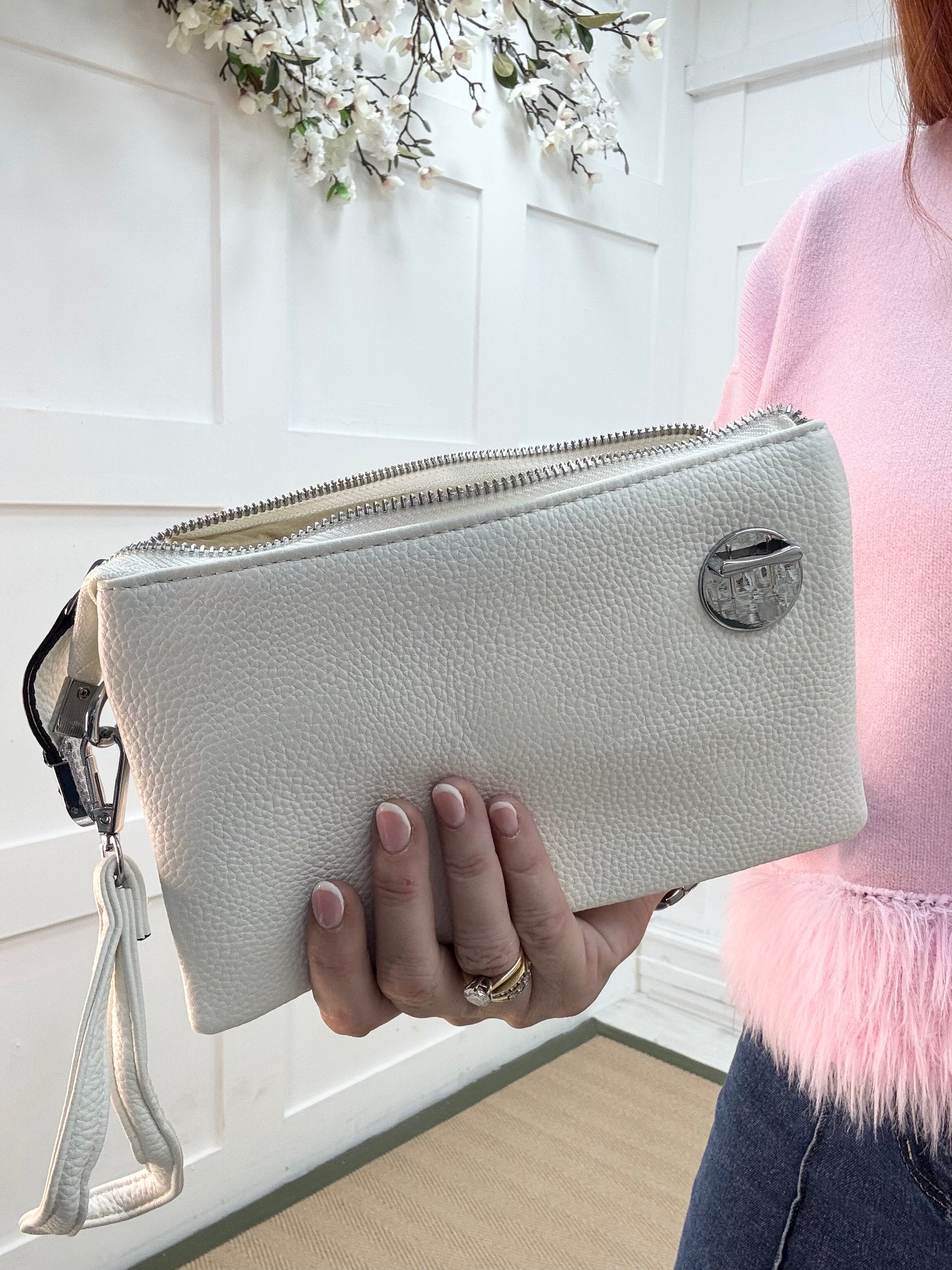 This sleek white crossbody bag features a slim, structured silhouette with a pebbled finish. Designed with three pockets for easy organisation, it includes a secure zip closure, polished silver-tone turn-lock detail, and a detachable wristlet handle. Finished with a wide adjustable strap, it’s a stylish hands-free essential for day-to-night wear.
