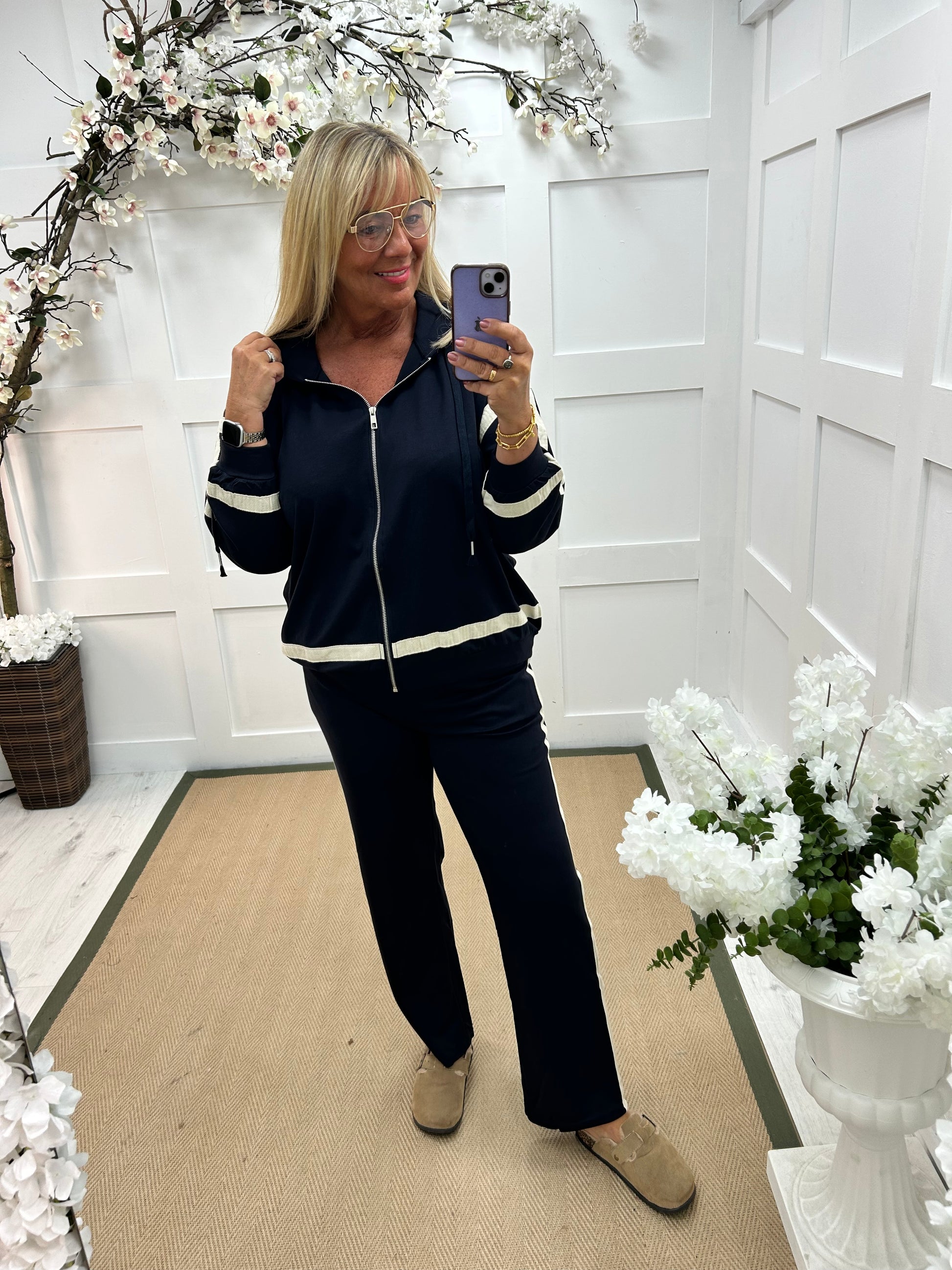This stretchy two-piece set features an oversized bomber jacket and matching wide-leg pants in navy blue with contrasting cream stripe detailing. The zip-up jacket offers a relaxed fit with dropped shoulders and pockets for laid-back comfort, while the soft, stretchy fabric ensures effortless style and movement — perfect for chic casual wear.