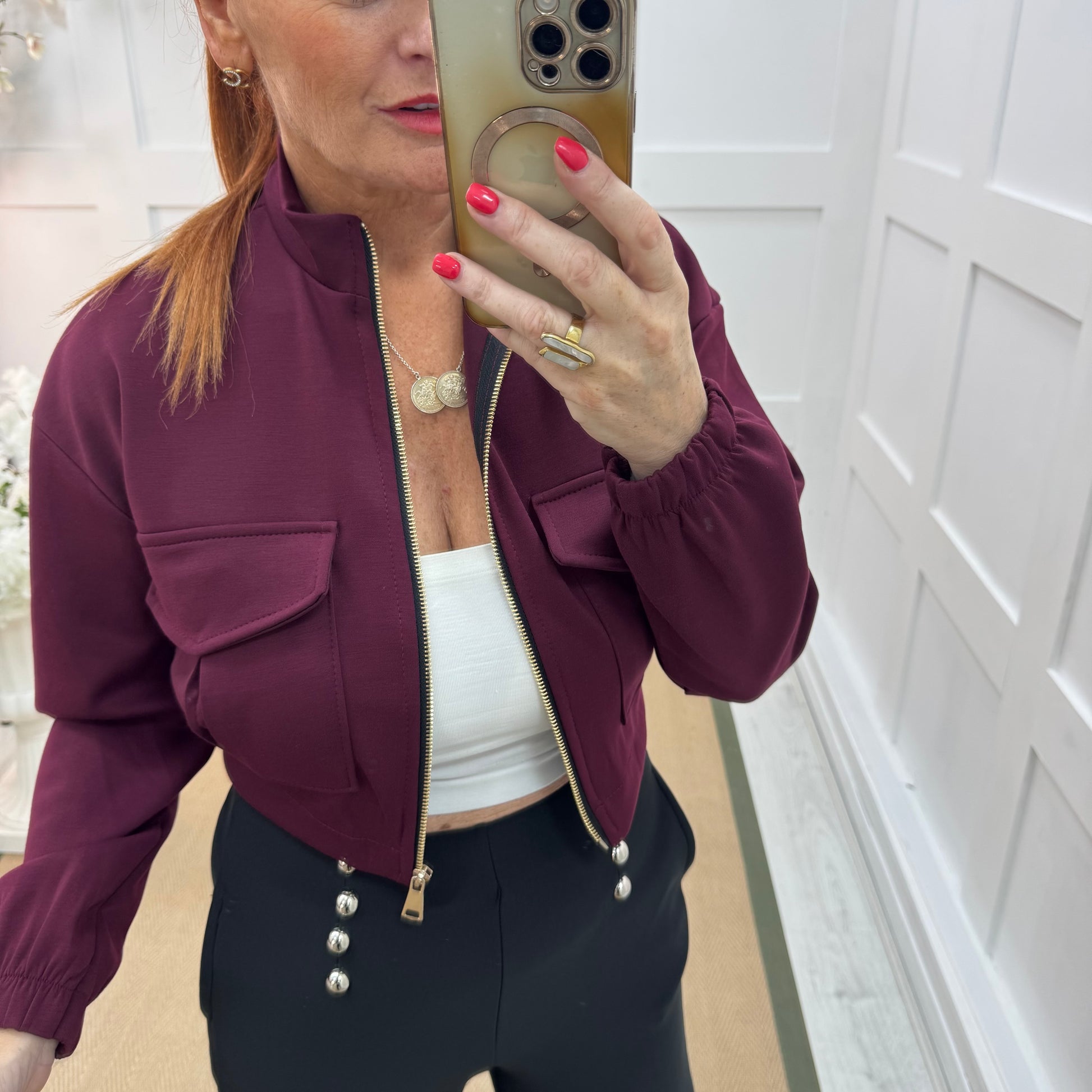 This stretchy bomber jacket in deep burgundy is a chic mix of comfort and style. Featuring a front zip closure, utility-inspired chest pockets, and elasticated cuffs, it offers a flattering cropped fit. The sleek stretch fabric moves with you, making it perfect for casual chic looks or pairing with tailored bottoms for effortless sophistication.