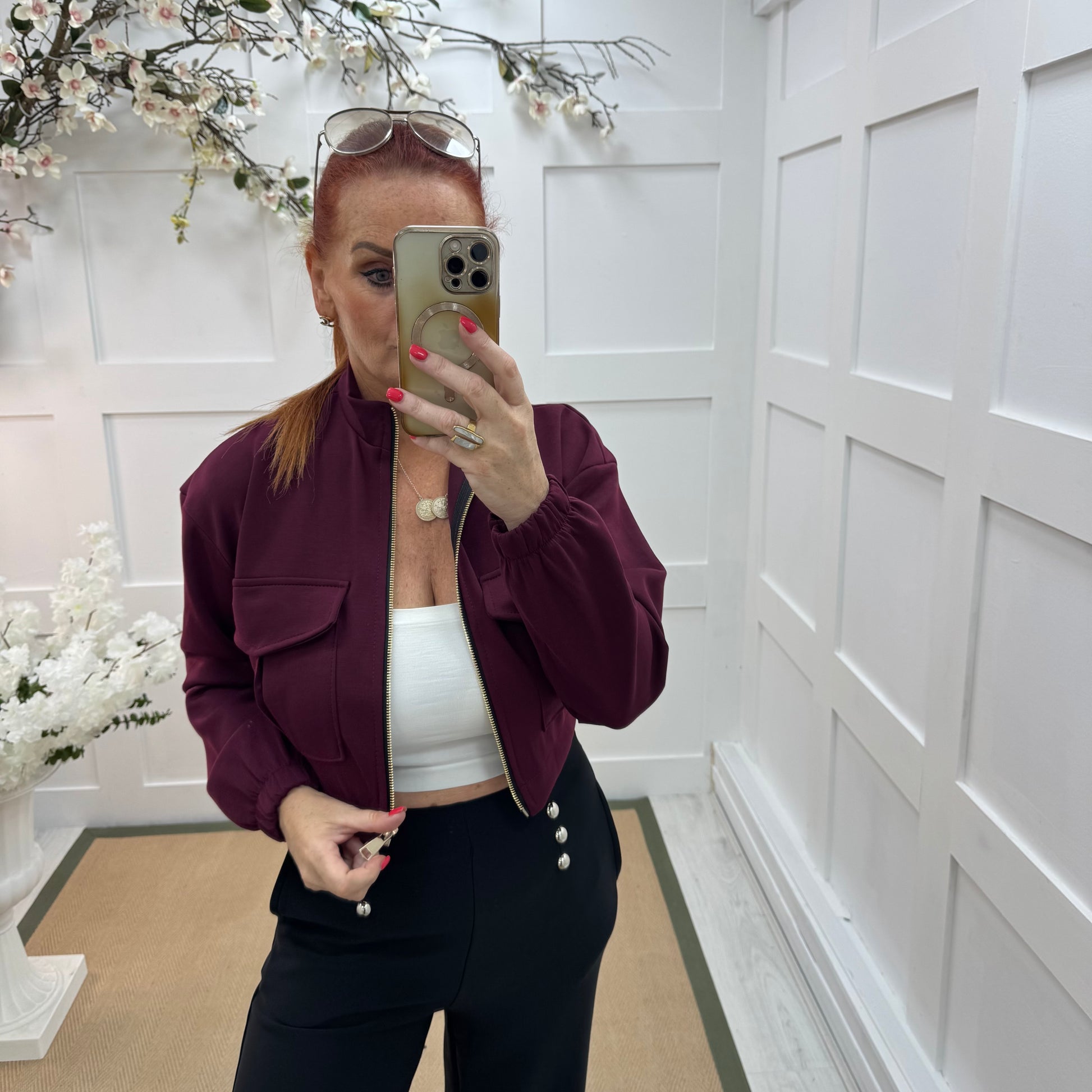 Bunty: Burgundy stretchy short bomber jacket. One size: 8-16