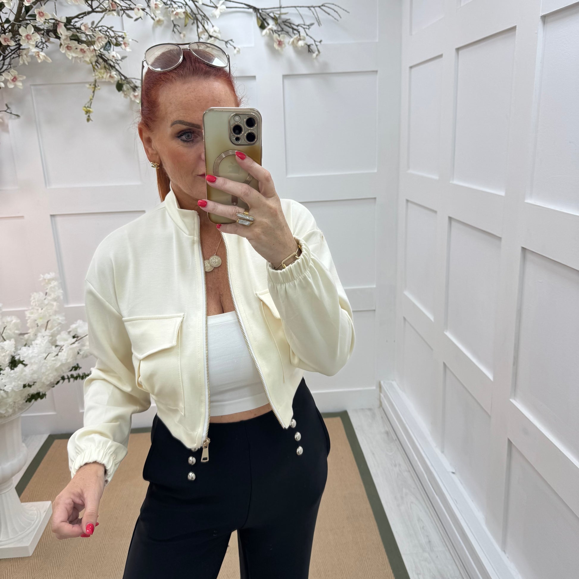 This stretchy bomber jacket in light cream is a chic mix of comfort and style. Featuring a front zip closure, utility-inspired chest pockets, and elasticated cuffs, it offers a flattering cropped fit. The sleek stretch fabric moves with you, making it perfect for casual chic looks or pairing with tailored bottoms for effortless sophistication.