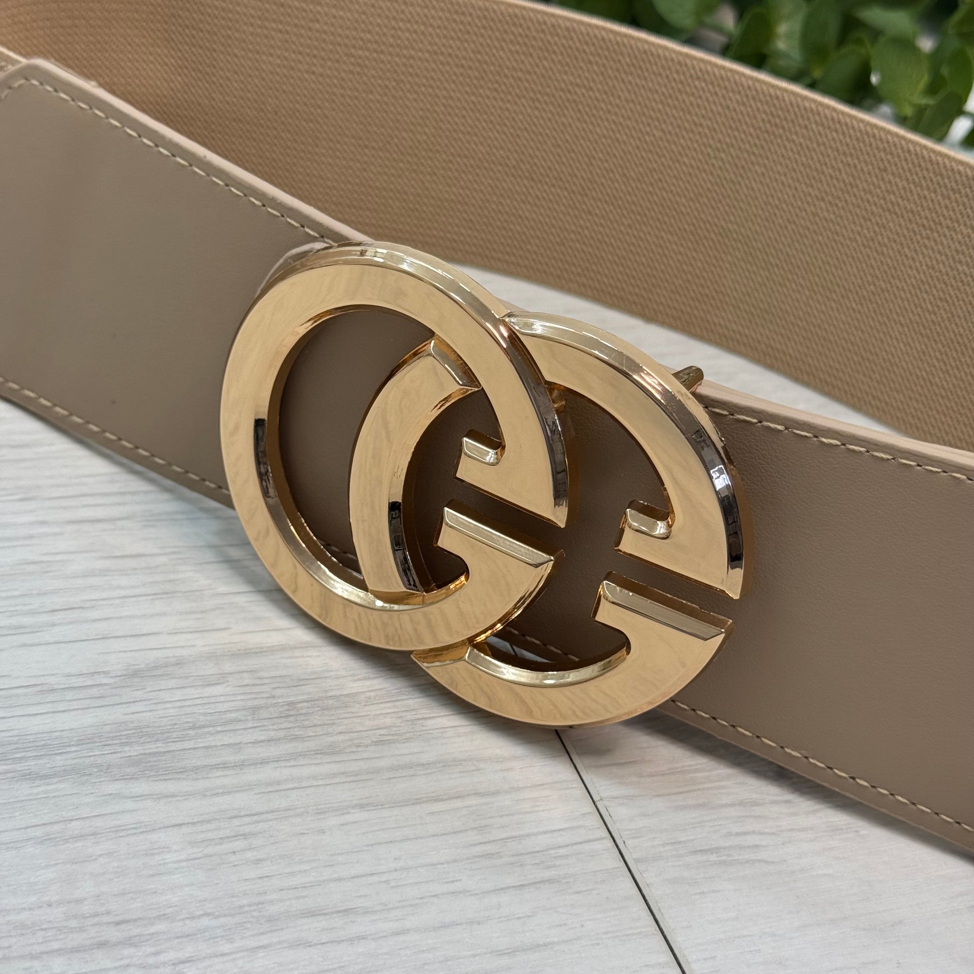 Calla: Beige gold GG buckle wide belt. One size: 8-16
