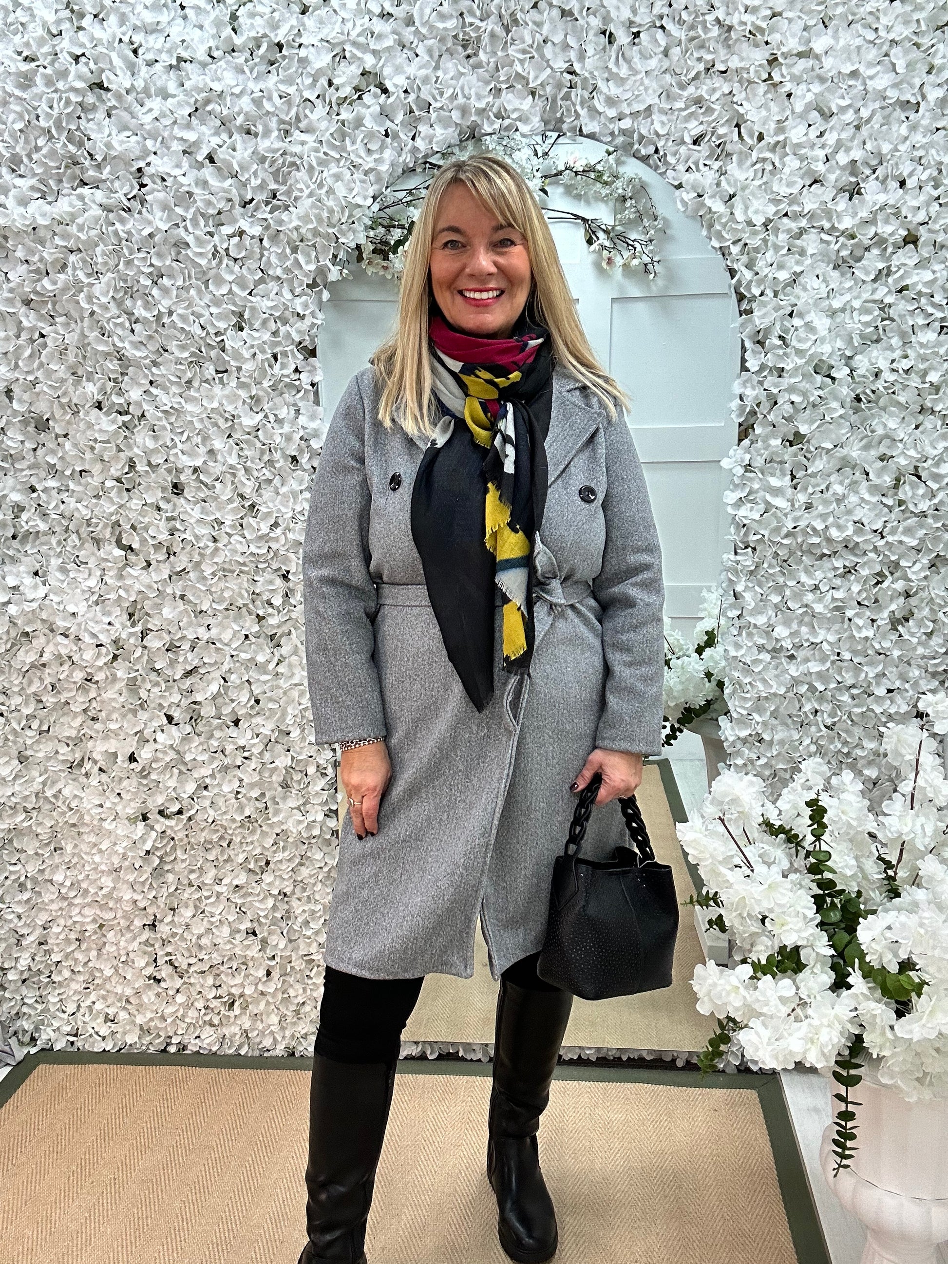 This coat features a soft grey wool-blend fabric with a structured lapel and double-breasted button closure. It has a clean, tailored silhouette with a matching belt for shaping. The design is timeless and versatile, ideal for layering and elevating everyday or professional outfits.