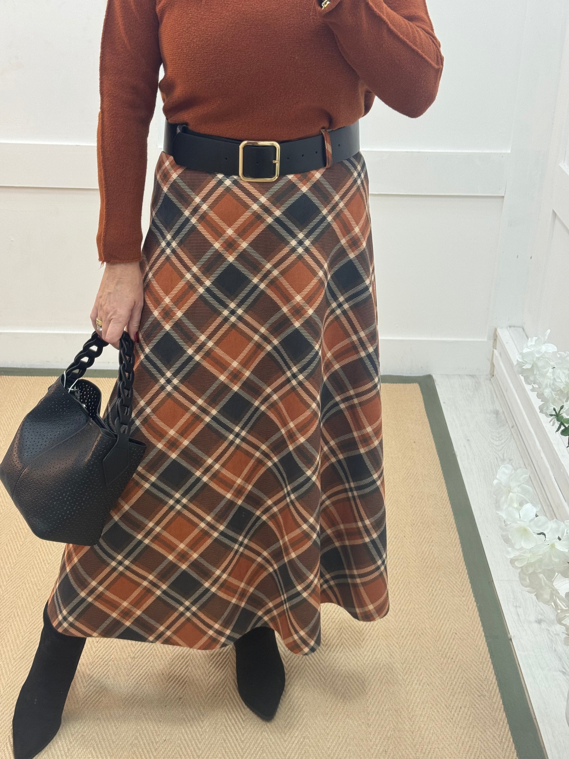 This stretchy belted skirt features an A line shape with a bold check pattern in earthy tones. The soft, flexible fabric offers all-day comfort while maintaining a luxurious look. Perfect for dressing up or down, it moves with you effortlessly—ideal for work, weekends, or stylish everyday wear, team up with one of our Bessie tops for a great look.