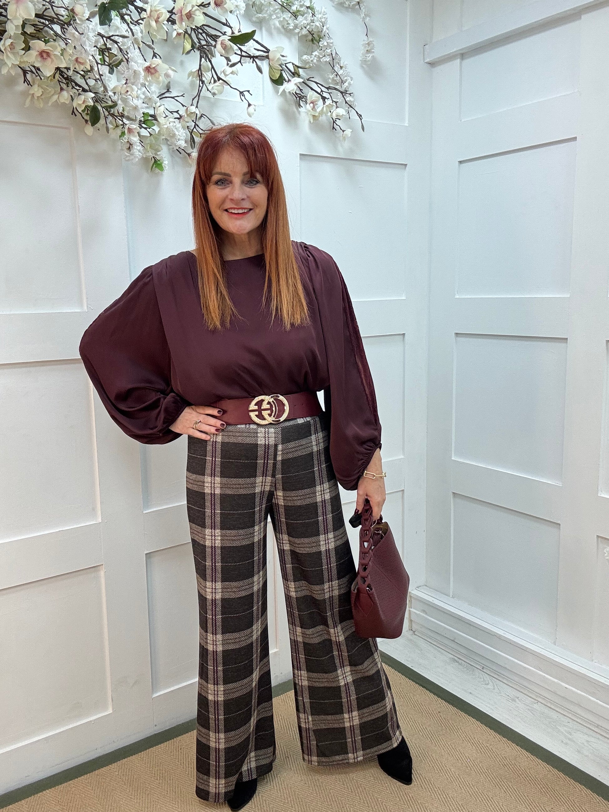 This elegant blouse features soft, flowing fabric in a rich burgundy with delicate lace panels running down the sleeves. Subtle gathers at the shoulders and cuffs add shape and femininity. Lightweight and versatile, it transitions effortlessly from day to night, pairing beautifully with trousers, skirts, or denim.