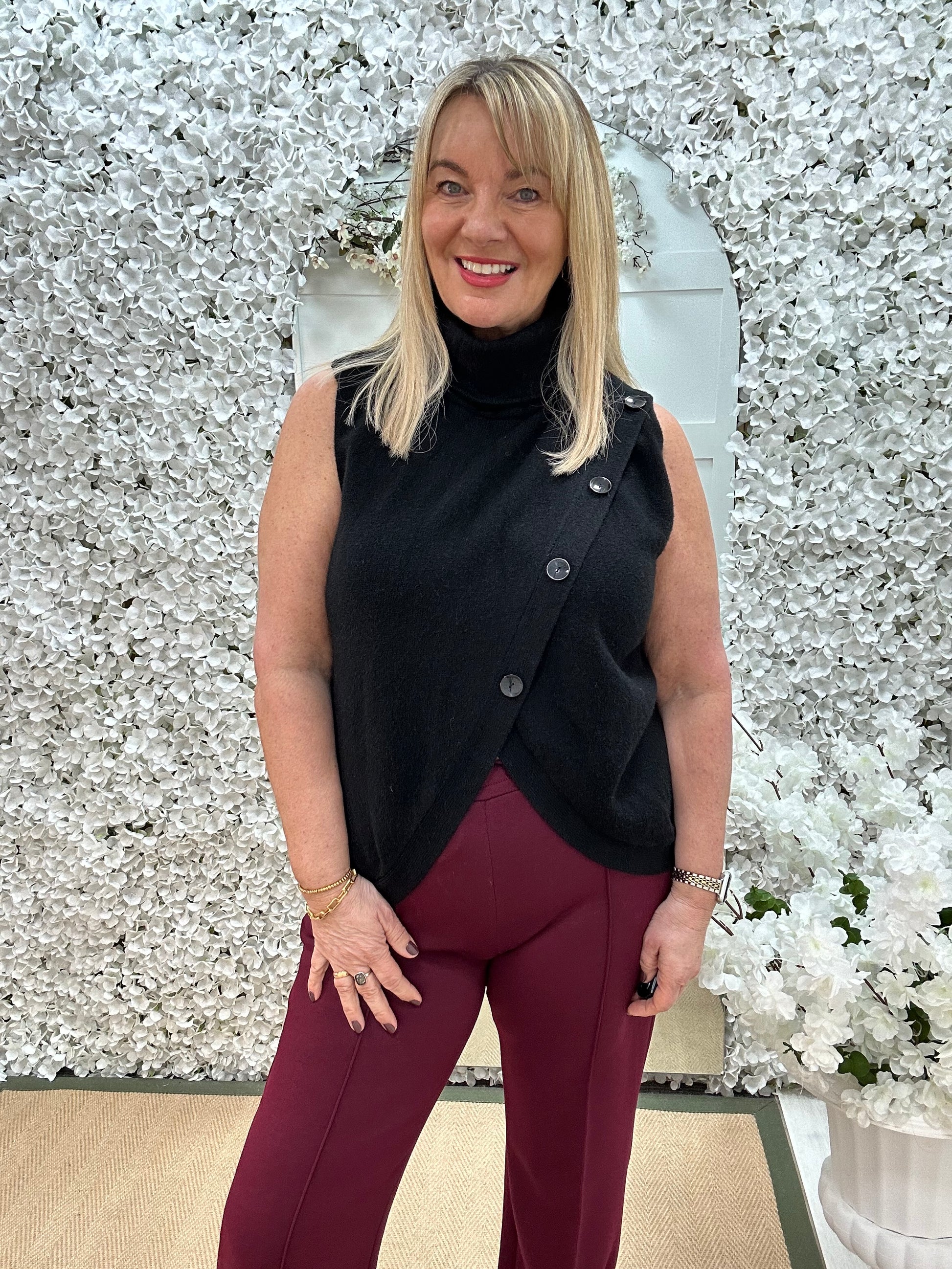 This stretchy knit wrap over top is effortlessly chic with its soft fabric and relaxed fit. Featuring a large button on the wrap over, it blends comfort with understated elegance. Perfect for pairing with Bessie basic top & leather trousers, it’s a versatile piece for both casual and dressy looks.