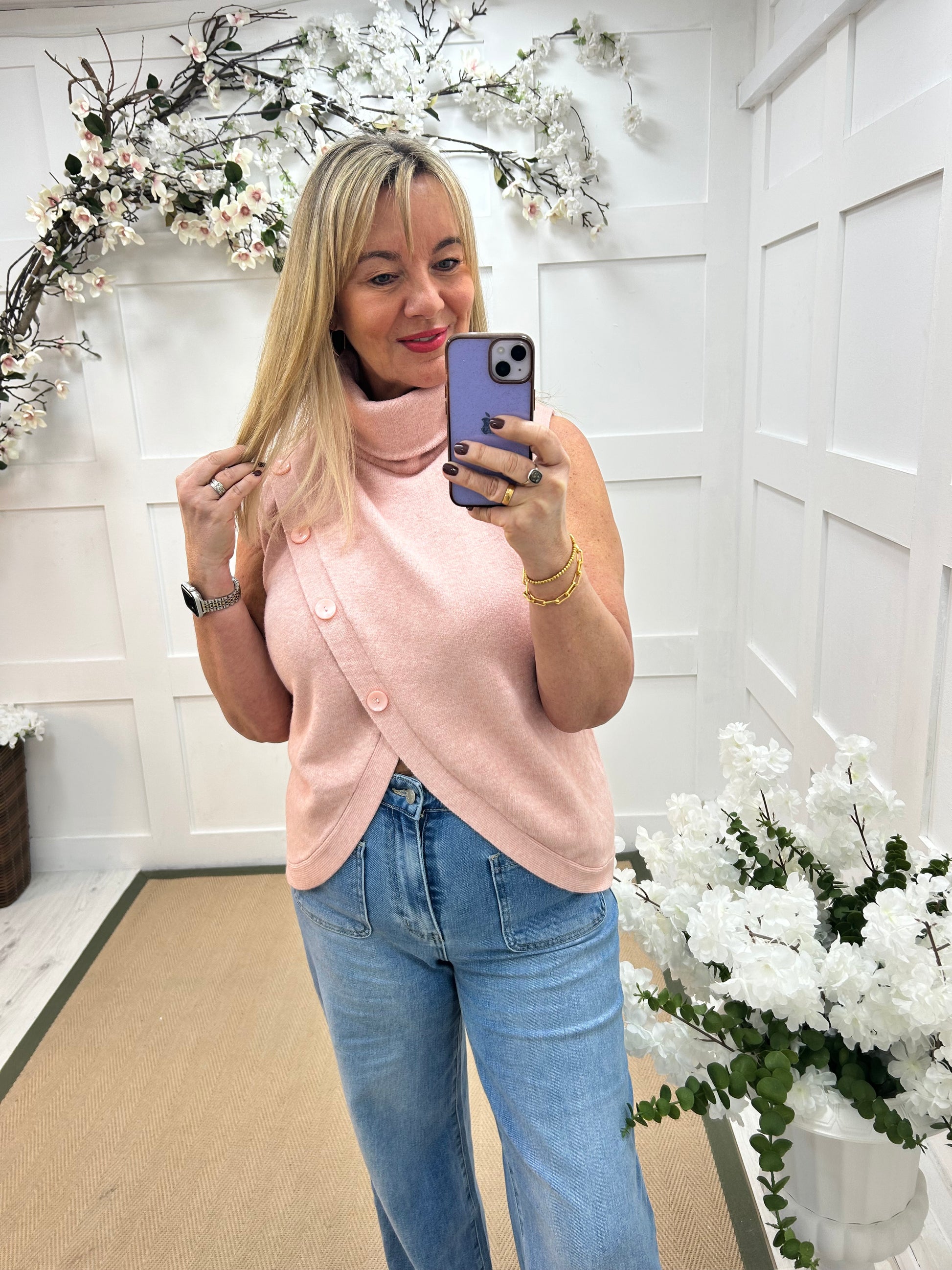 Carmen: Pink sleeveless cowl neck wrap top. One Sz: 10- 16