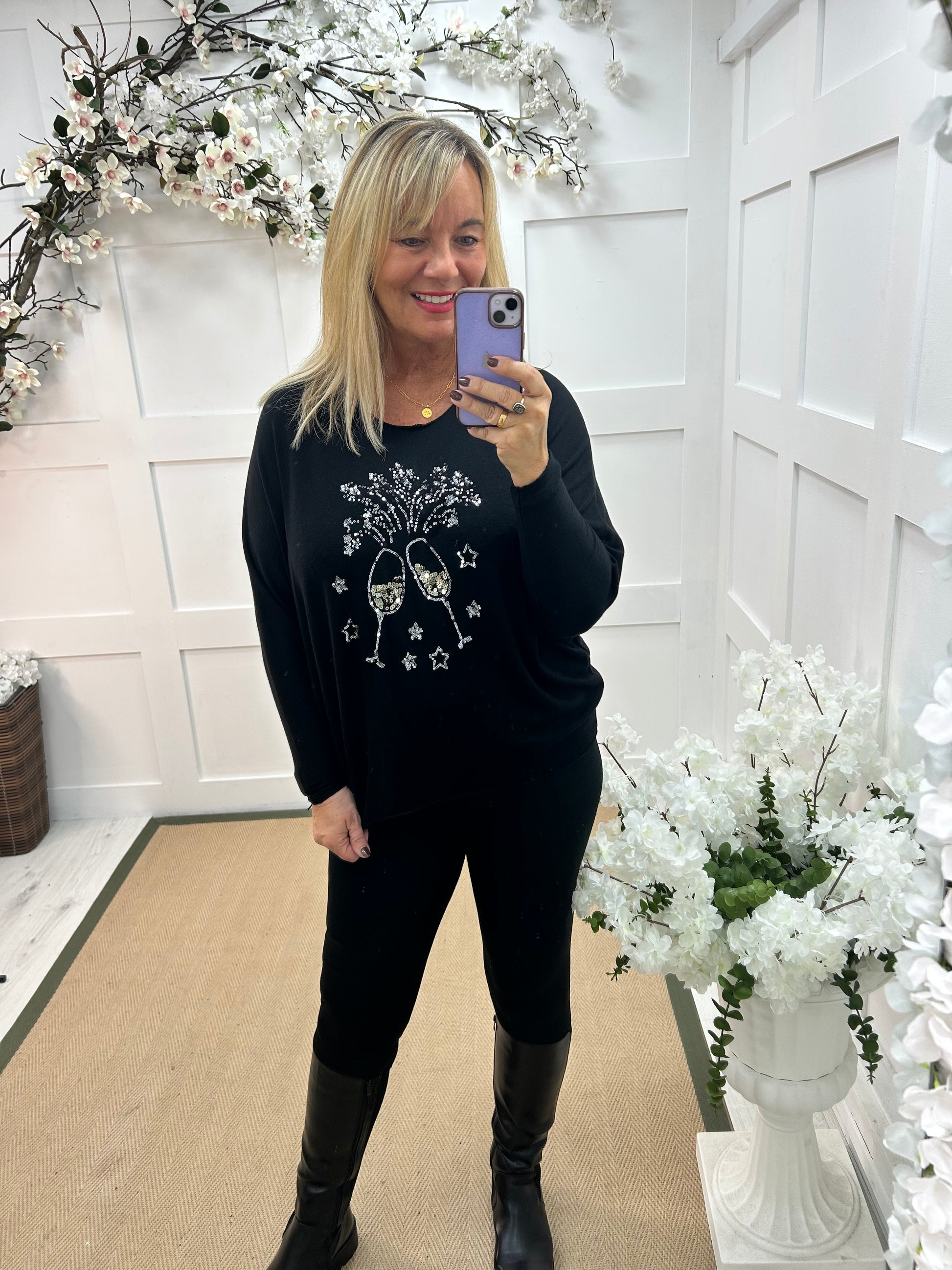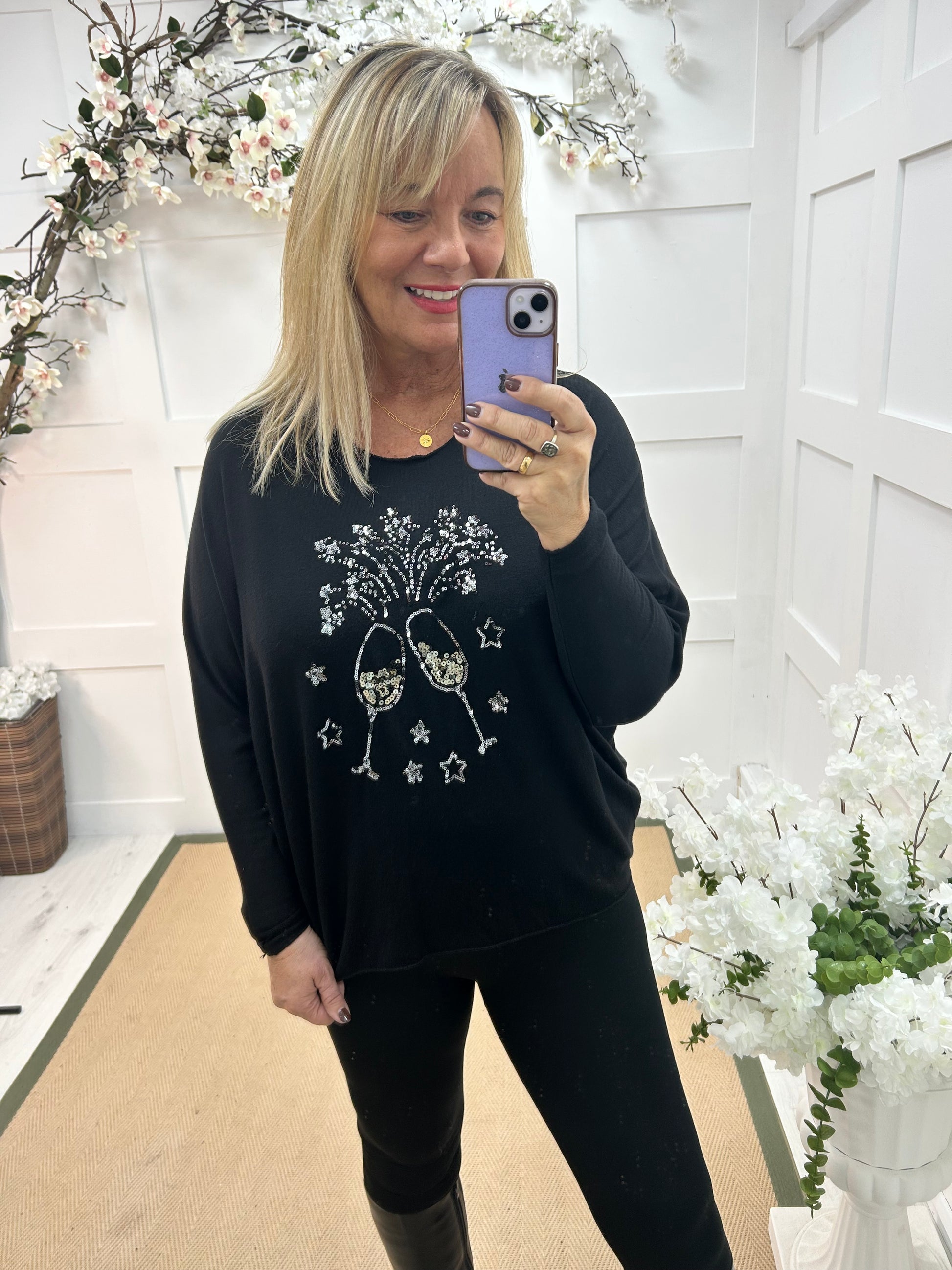 This black relaxed-fit Christmas top features a shimmering sequin design of two clinking wine glasses surrounded by twinkling stars. Crafted from a soft blend of viscose, elastane, and nylon, it offers comfort with a touch of festive glamour, perfect for casual parties or evenings out.