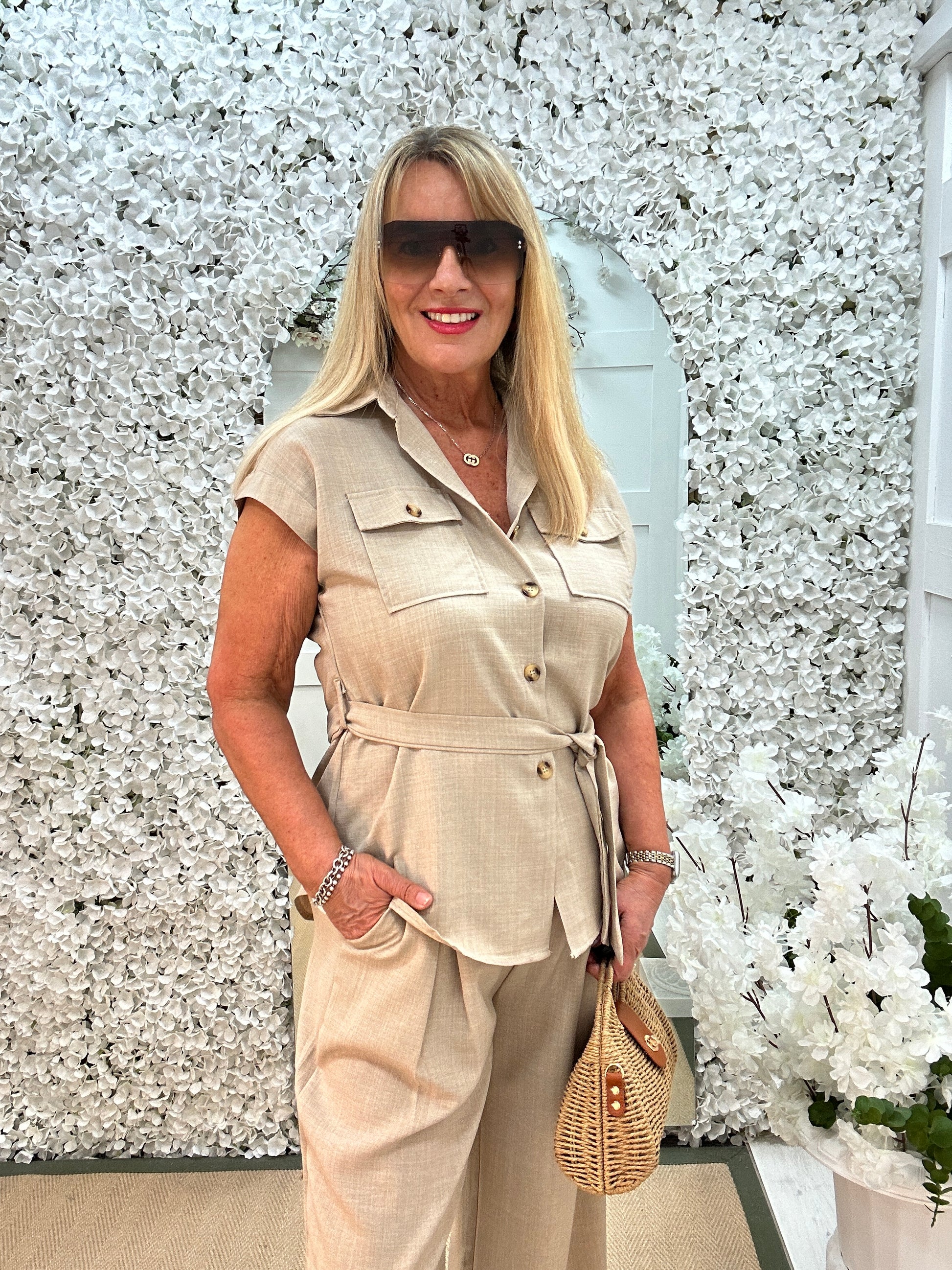 Clara: Beige belted shirt & trouser safari set. 2 sizes.