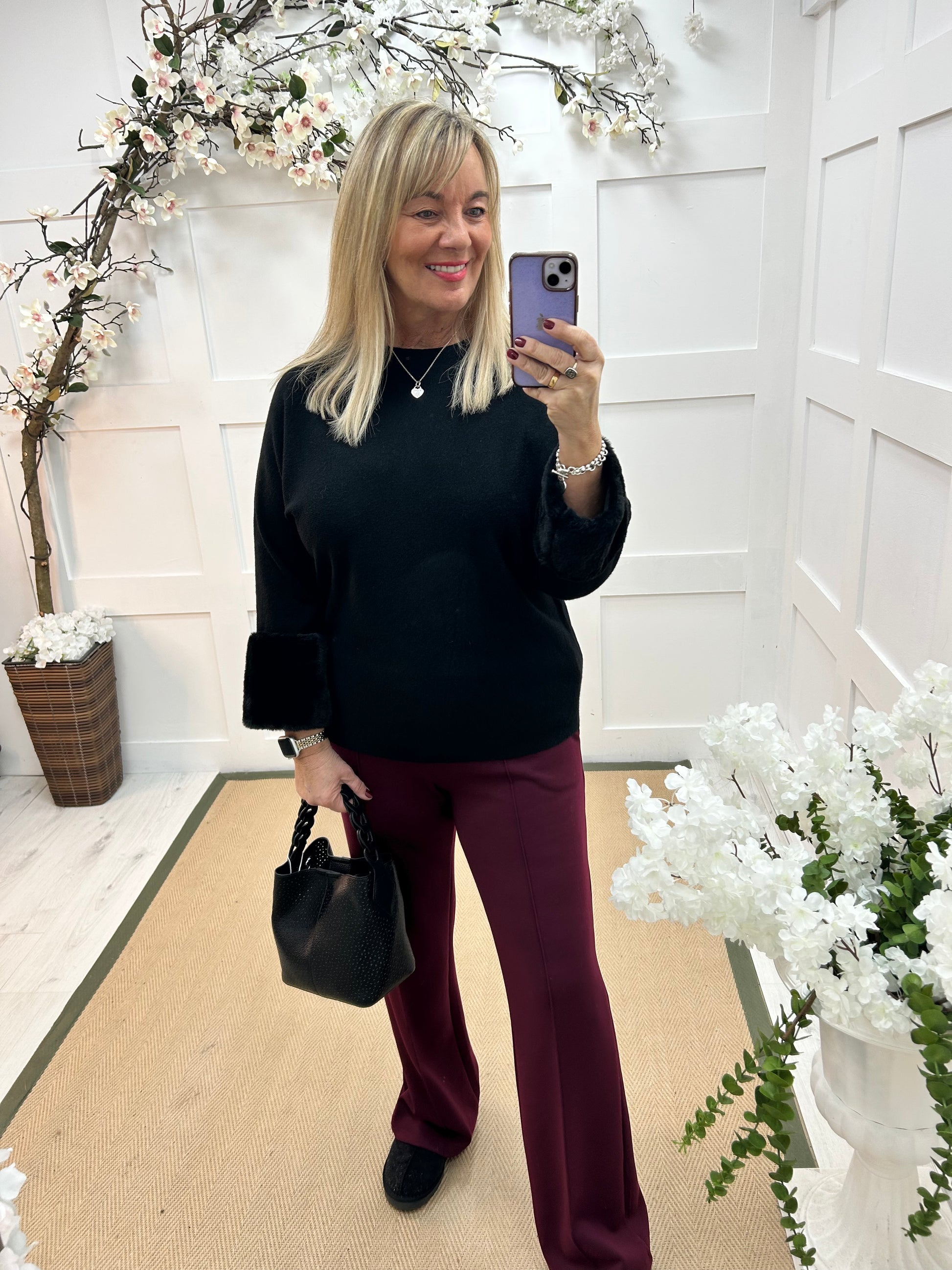 This soft, oversized black sweater hangs gently, its relaxed shape creating an effortless, cozy feel. The subtle knit texture adds warmth, while the standout faux fur cuffs bring a touch of luxury and charm. Perfect for cool days, it blends comfort with elegant detail for an easy, stylish look.