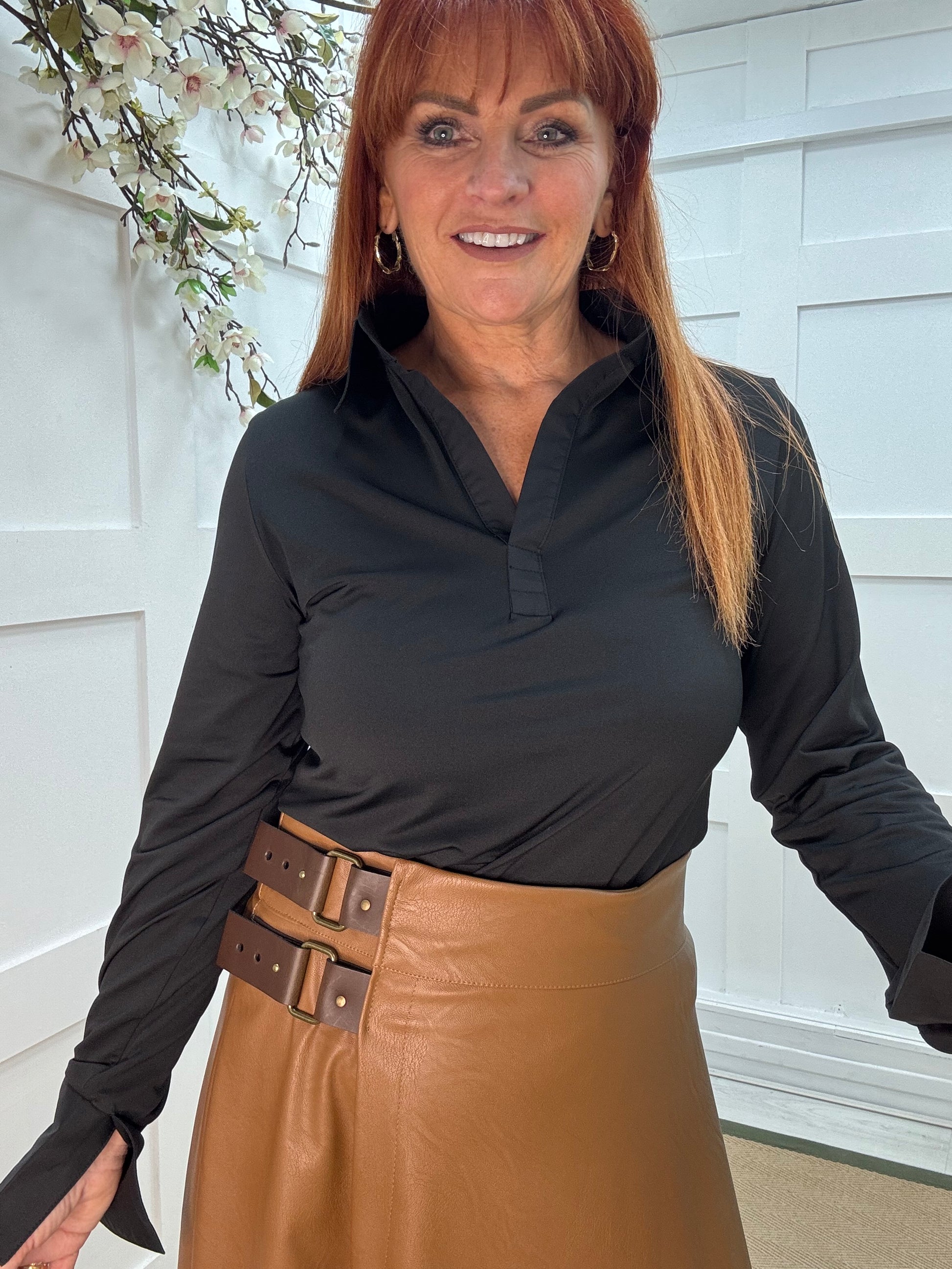 This stretchy pull-on layering shirt combines comfort and polish. Featuring a crisp cotton collar and cuffs for a classic shirt look, its stretchy fabric body ensures a smooth, flexible fit. Designed for easy layering under waistcoats or jumpers, it offers a neat finish without bulk—perfect for chic, fuss-free everyday styling.