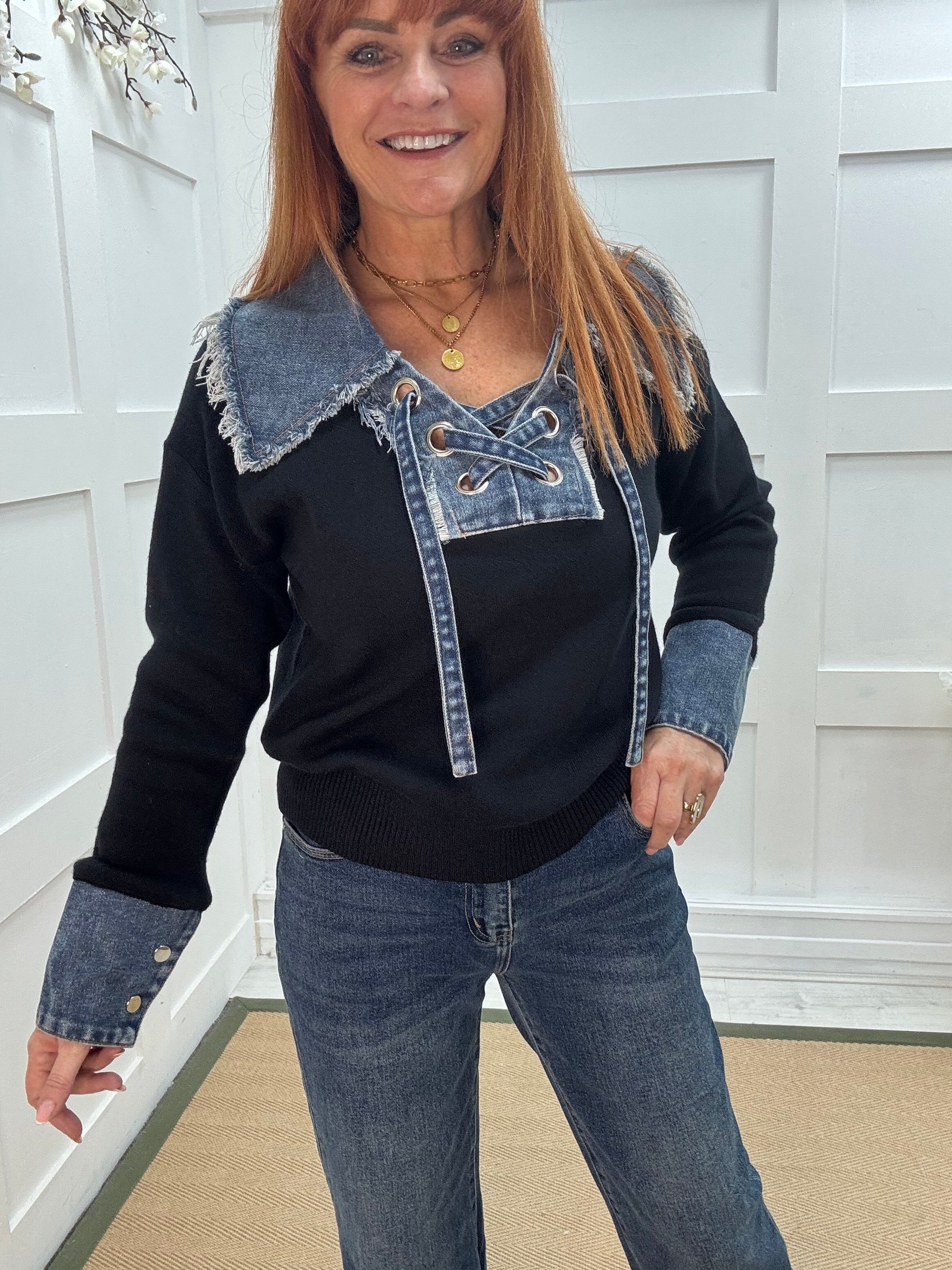 The top is a stylish beige knit with striking denim accents. It features a lace-up neckline trimmed with frayed denim and matching denim cuffs for a chic, layered look. The relaxed fit and mixed textures create a trendy, casual vibe that pairs perfectly with jeans for effortless everyday style.