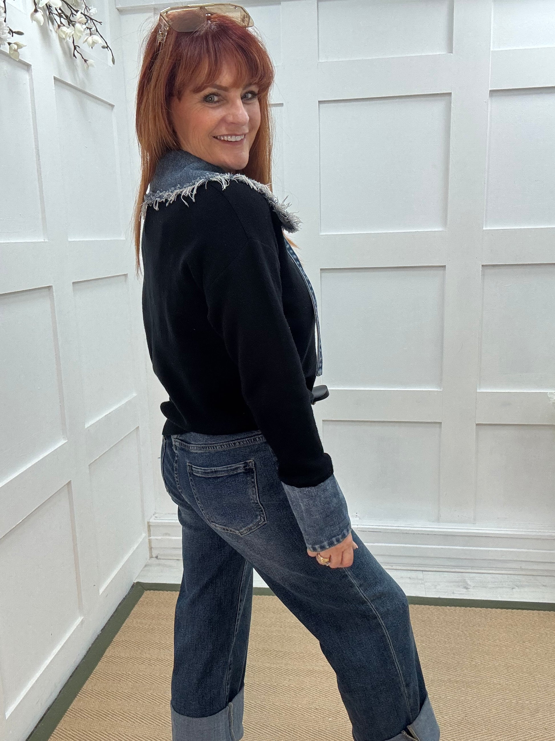Malin: Black denim collar long sleeve top. One size: 12-18