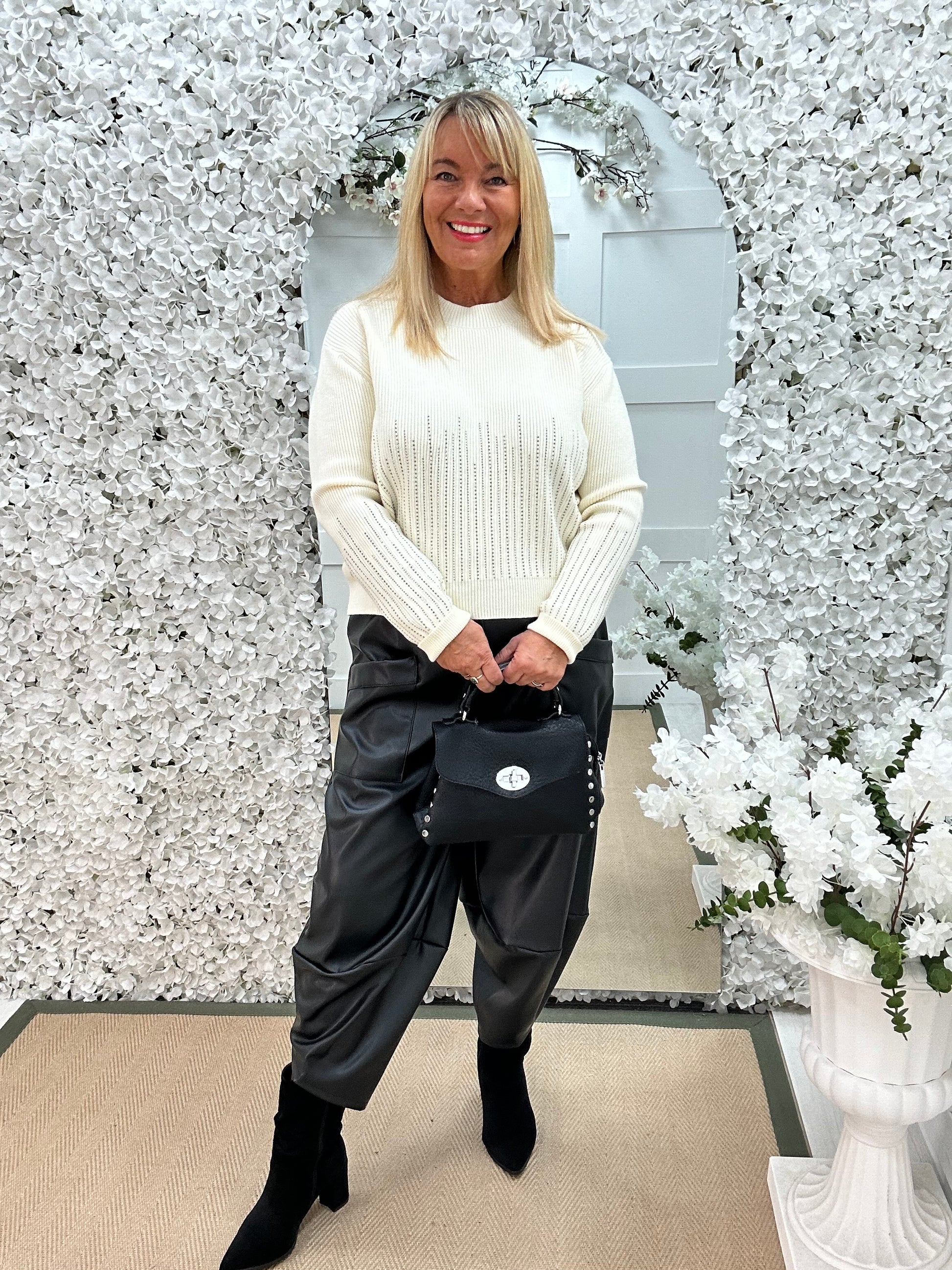 This soft, stretchy knit combines comfort with subtle glamour. In a beautiful white, it features a round neckline and long sleeves for easy wear. The standout detail is the diamanté detailing on both sleeves and the front of the knit. Effortlessly chic, it transitions from day to evening with ease. Perfect to pair with our Quinn leather trousers.