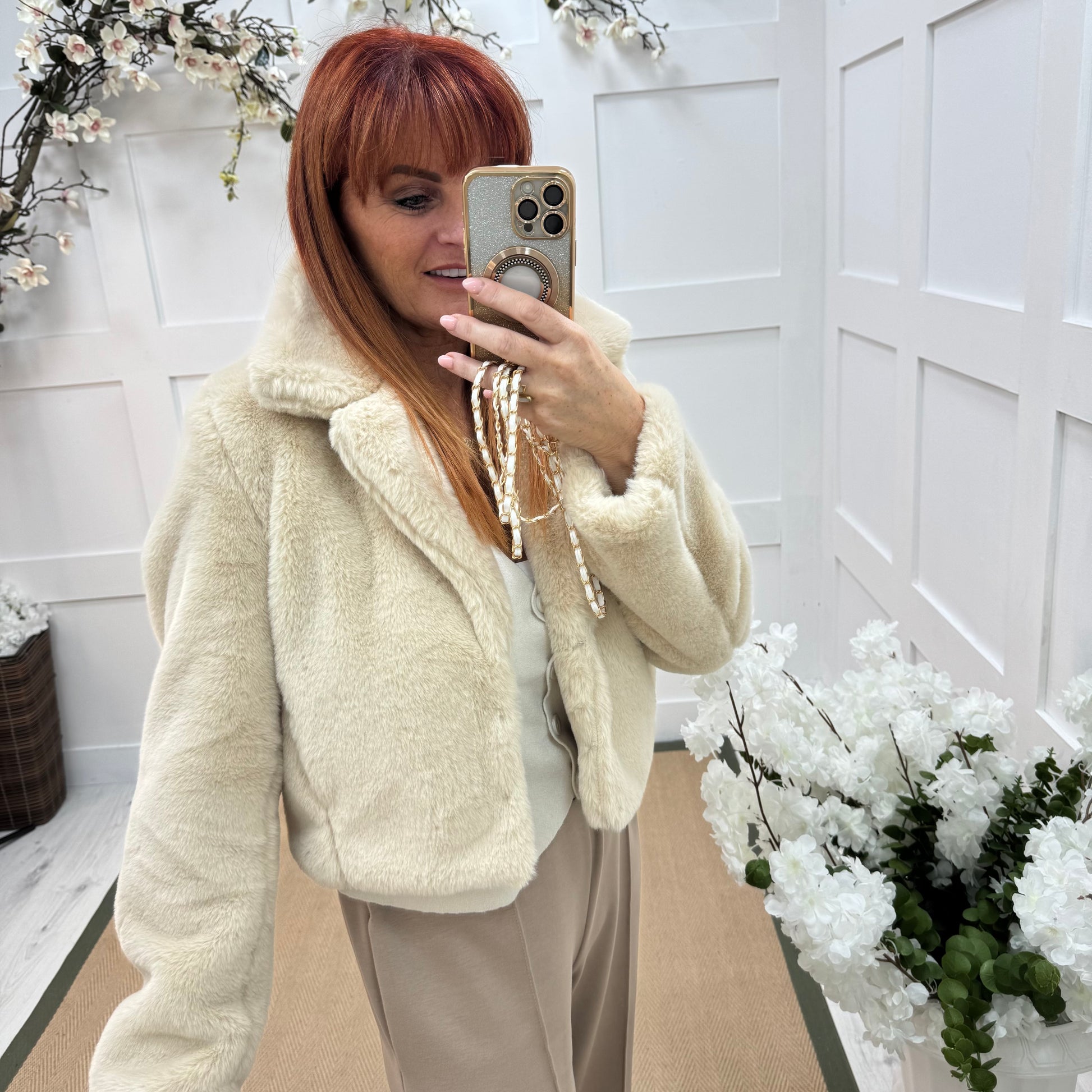 A faux fur wide collar jacket combines warmth with style in a playful, girly design. Soft and fluffy, it features a hook front and practical side pockets. Perfect for layering over short sleeves or knits, this cosy piece adds texture, charm, and comfort while keeping your look effortlessly chic and fun