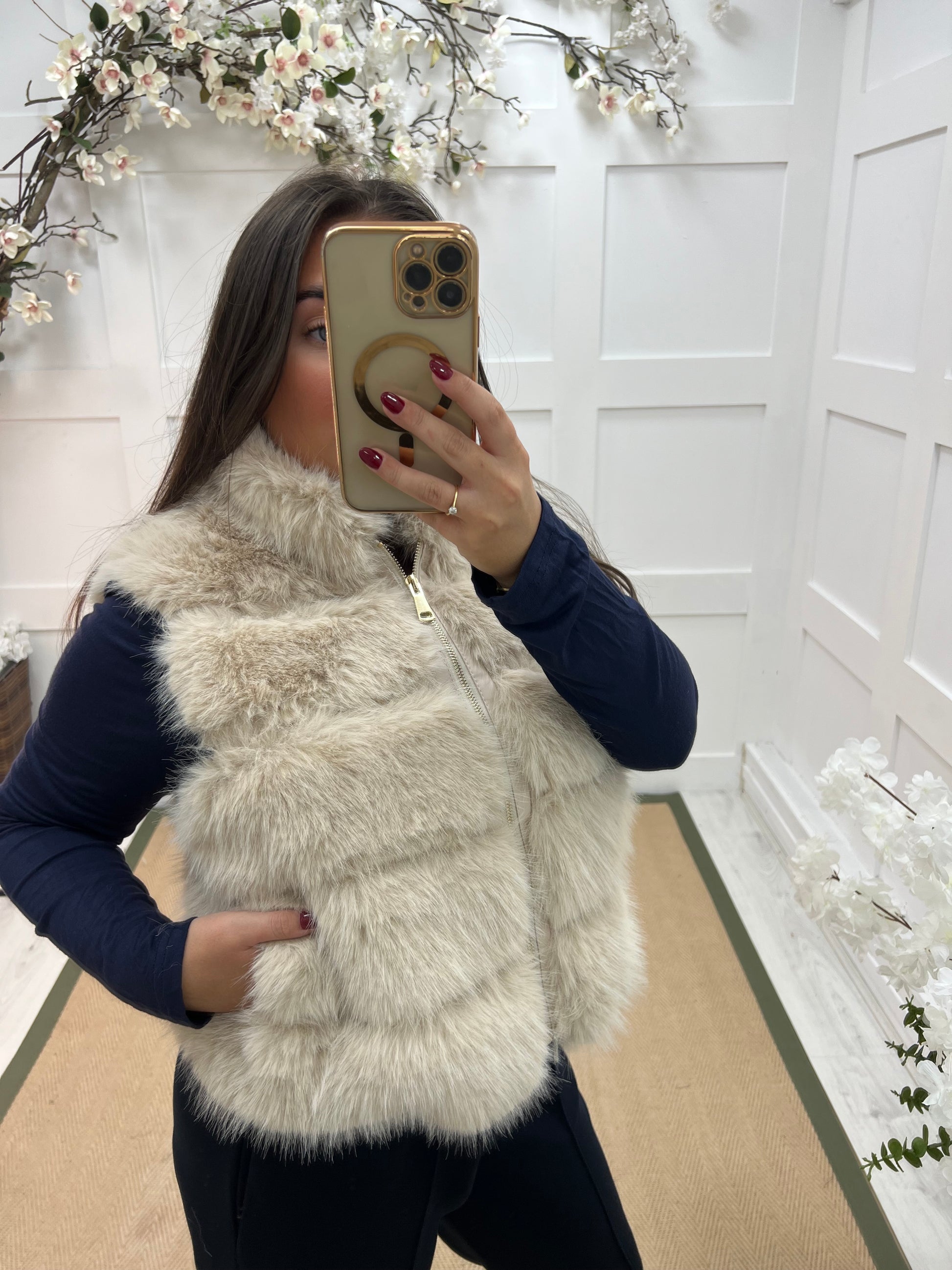 This faux fur gilet is the perfect blend of cozy and chic. Featuring a soft, plush texture in a cream tone, it adds instant luxury to any outfit. The zip-front design and side pockets make it both stylish and practical—ideal for layering over knits on cool days.