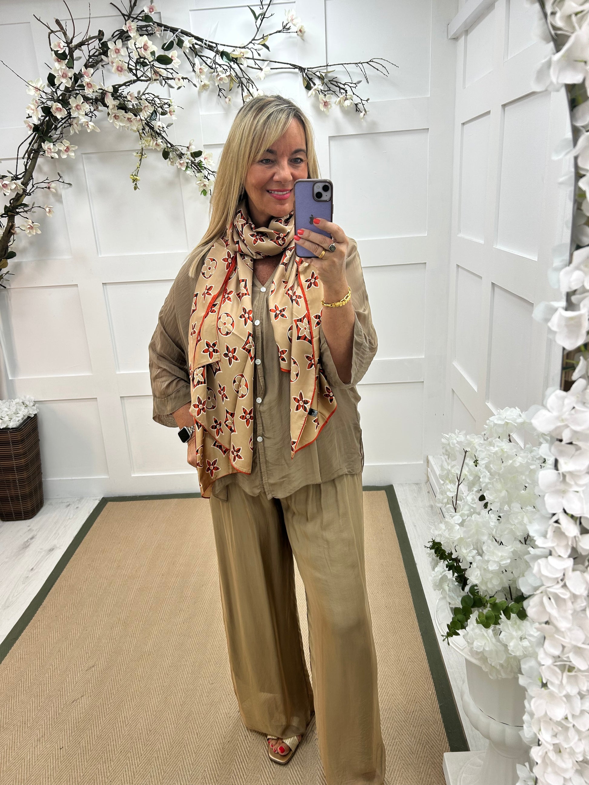 This elegant sand ladies’ scarf is a soft, lightweight silk mix fabric that drapes beautifully for a delicate, airy feel. Scattered across the material is a unique pattern, adding a sophisticated touch. The designer statement piece, perfect for adding a hint of glam to any outfit while maintaining an elegant, feminine look.