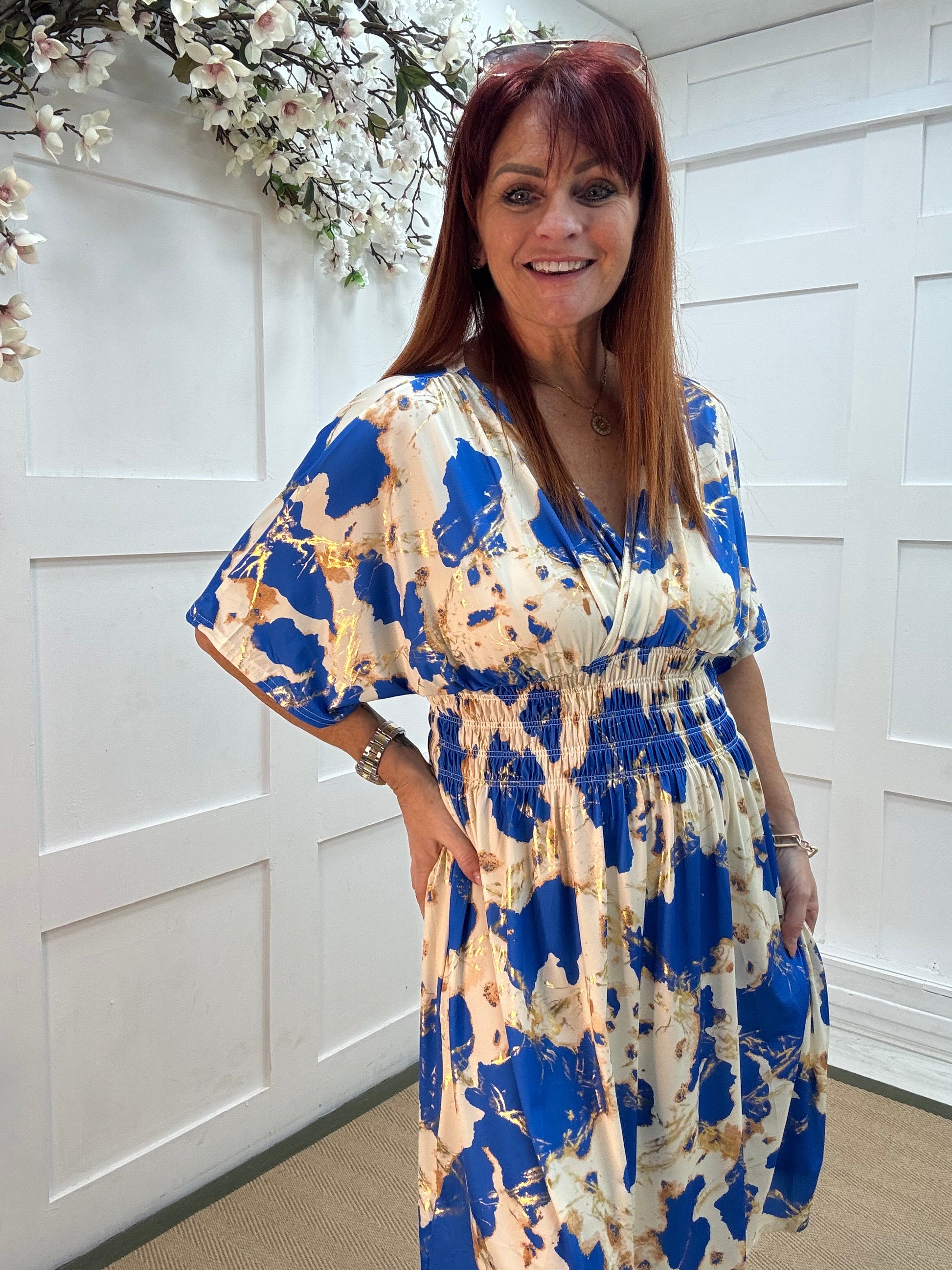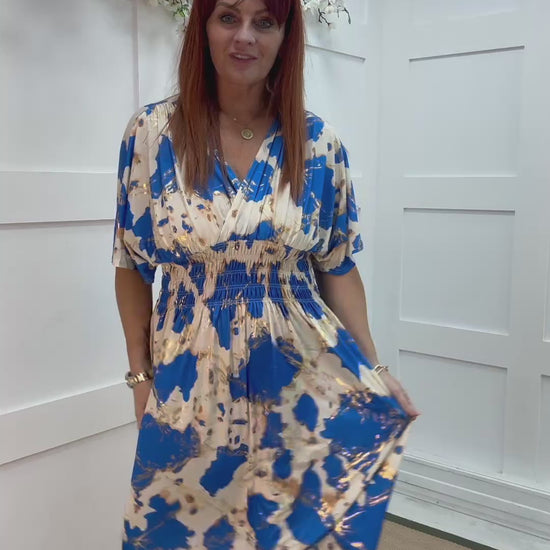 A flowing blue and cream print midi dress with subtle gold fleck detailing, designed with a flattering wrap-over neckline and graceful short angel sleeves. The shirred waist gently cinches for a comfortable, stretchy fit that enhances your natural shape. Effortlessly chic and easy to wear, this versatile midi dress blends elegance with all-day comfort — perfect for any occasion.
