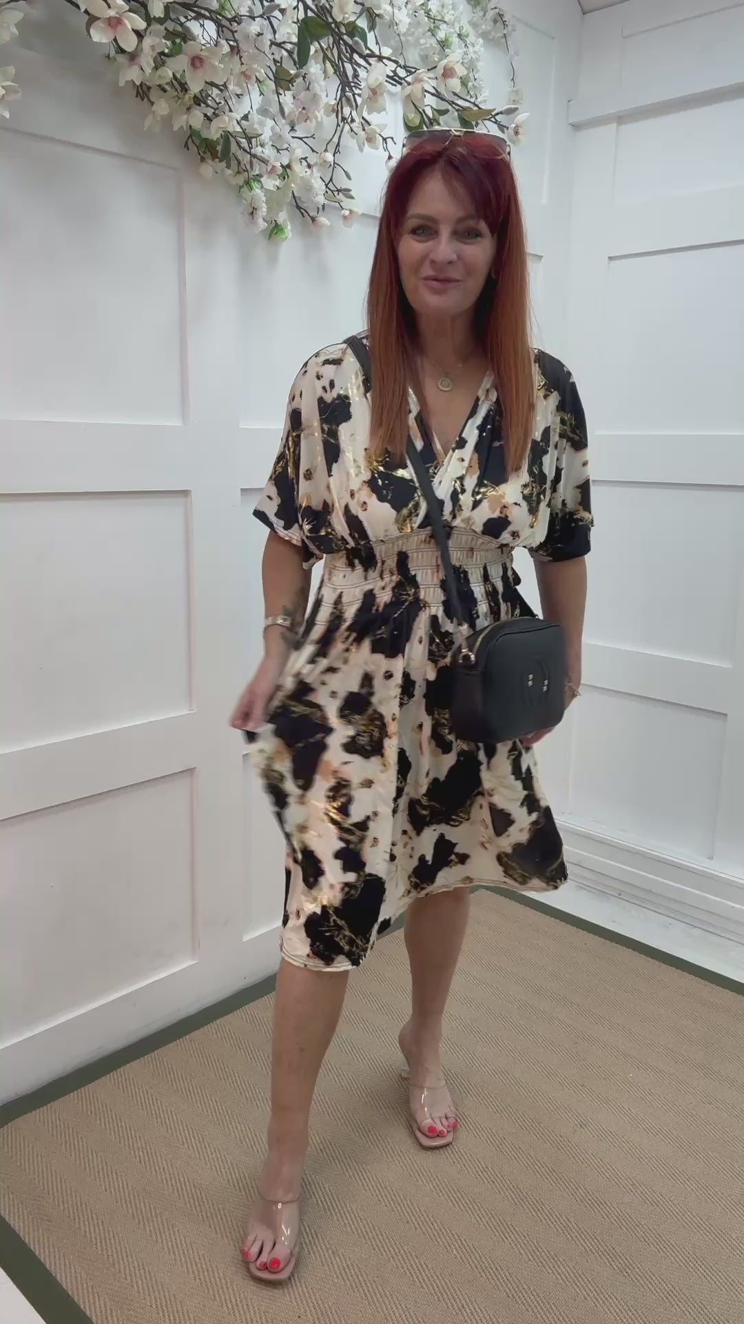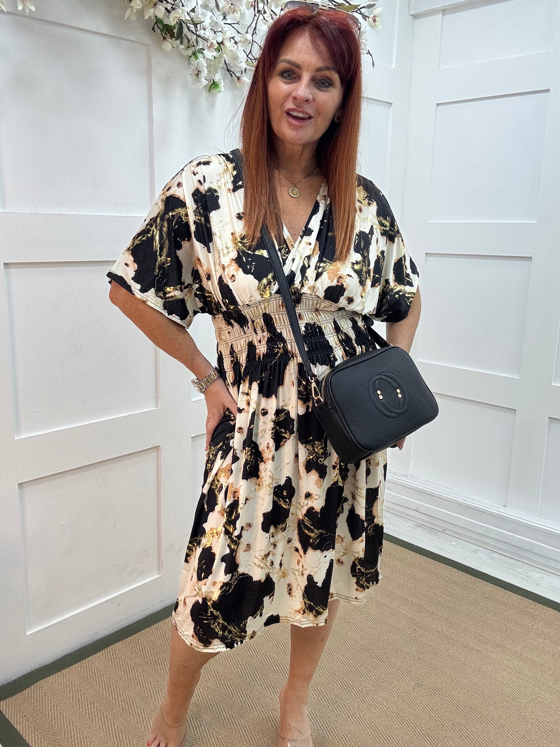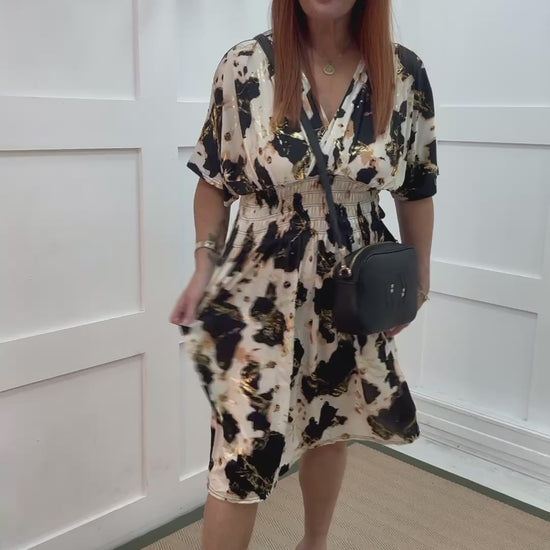 A flowing black and cream print midi dress with subtle gold fleck detailing, designed with a flattering wrap-over neckline and graceful short angel sleeves. The shirred waist gently cinches for a comfortable, stretchy fit that enhances your natural shape. Effortlessly chic and easy to wear, this versatile midi dress blends elegance with all-day comfort — perfect for any occasion.