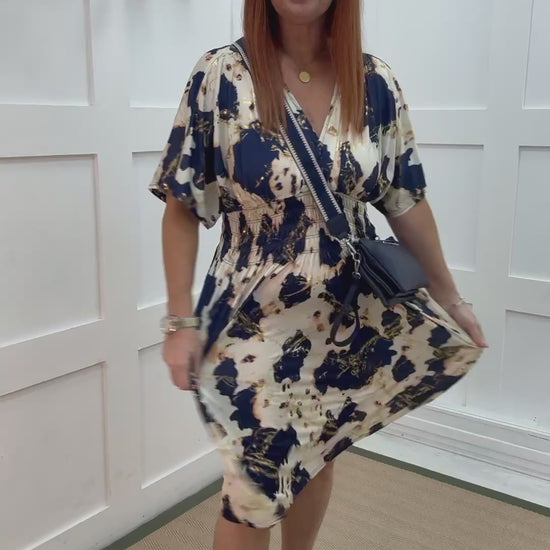 A flowing Navy and cream print midi dress with subtle gold fleck detailing, designed with a flattering wrap-over neckline and graceful short angel sleeves. The shirred waist gently cinches for a comfortable, stretchy fit that enhances your natural shape. Effortlessly chic and easy to wear, this versatile midi dress blends elegance with all-day comfort — perfect for any occasion.