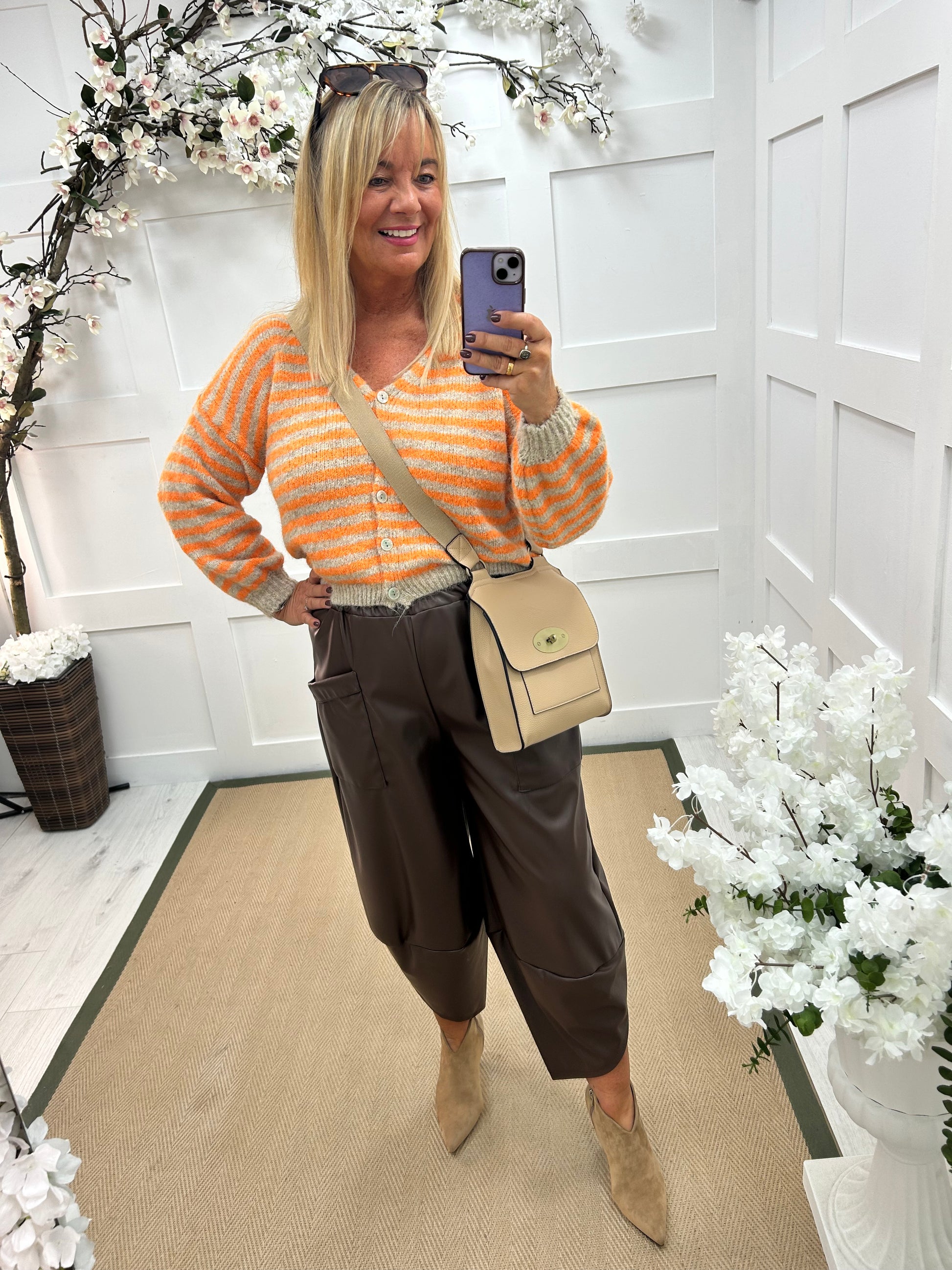 Drew: Brown faux leather cocoon trousers. One size: 12-18