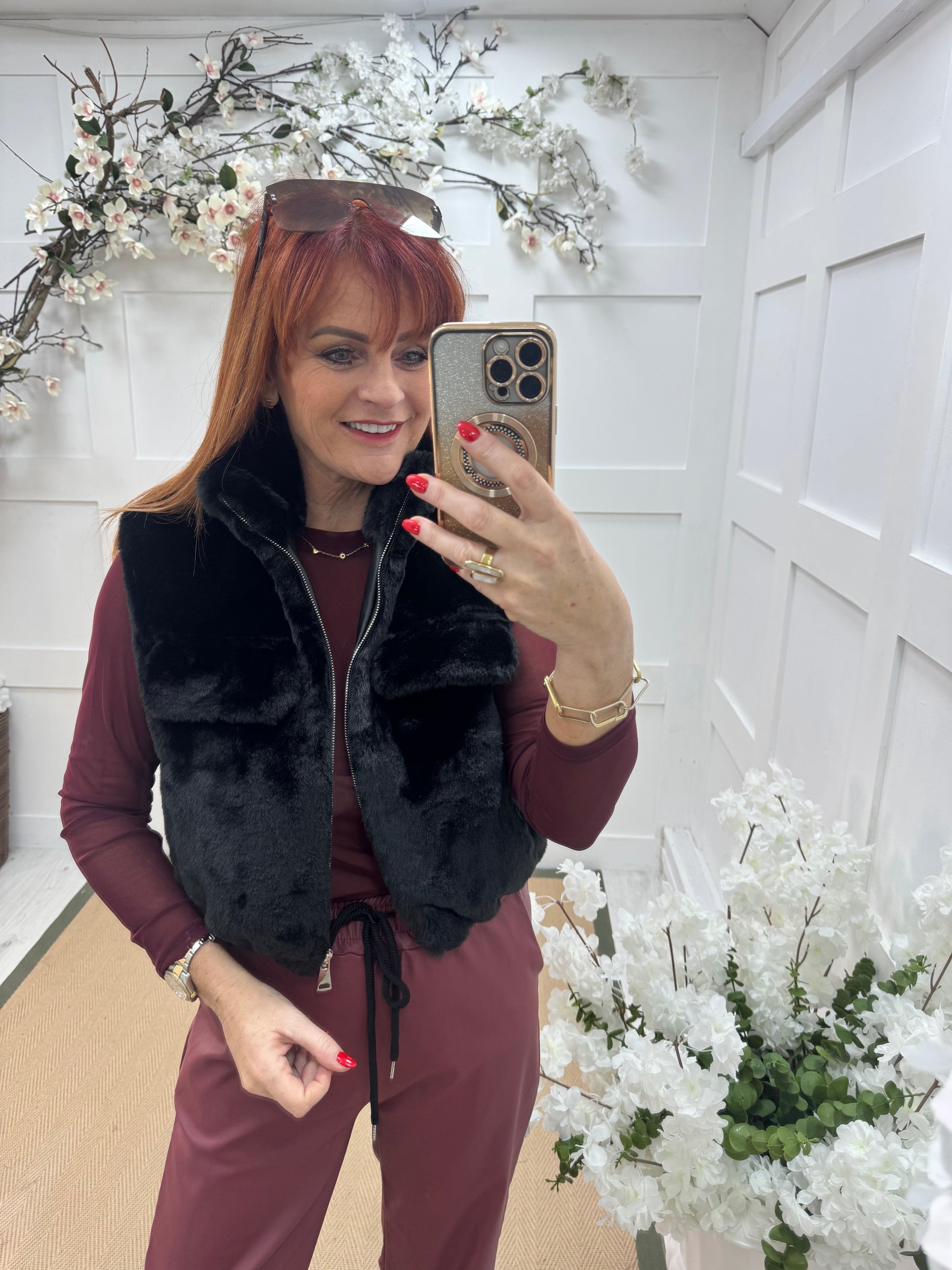 Effie: Black teddy bear faux fur gilet. One size 8-14