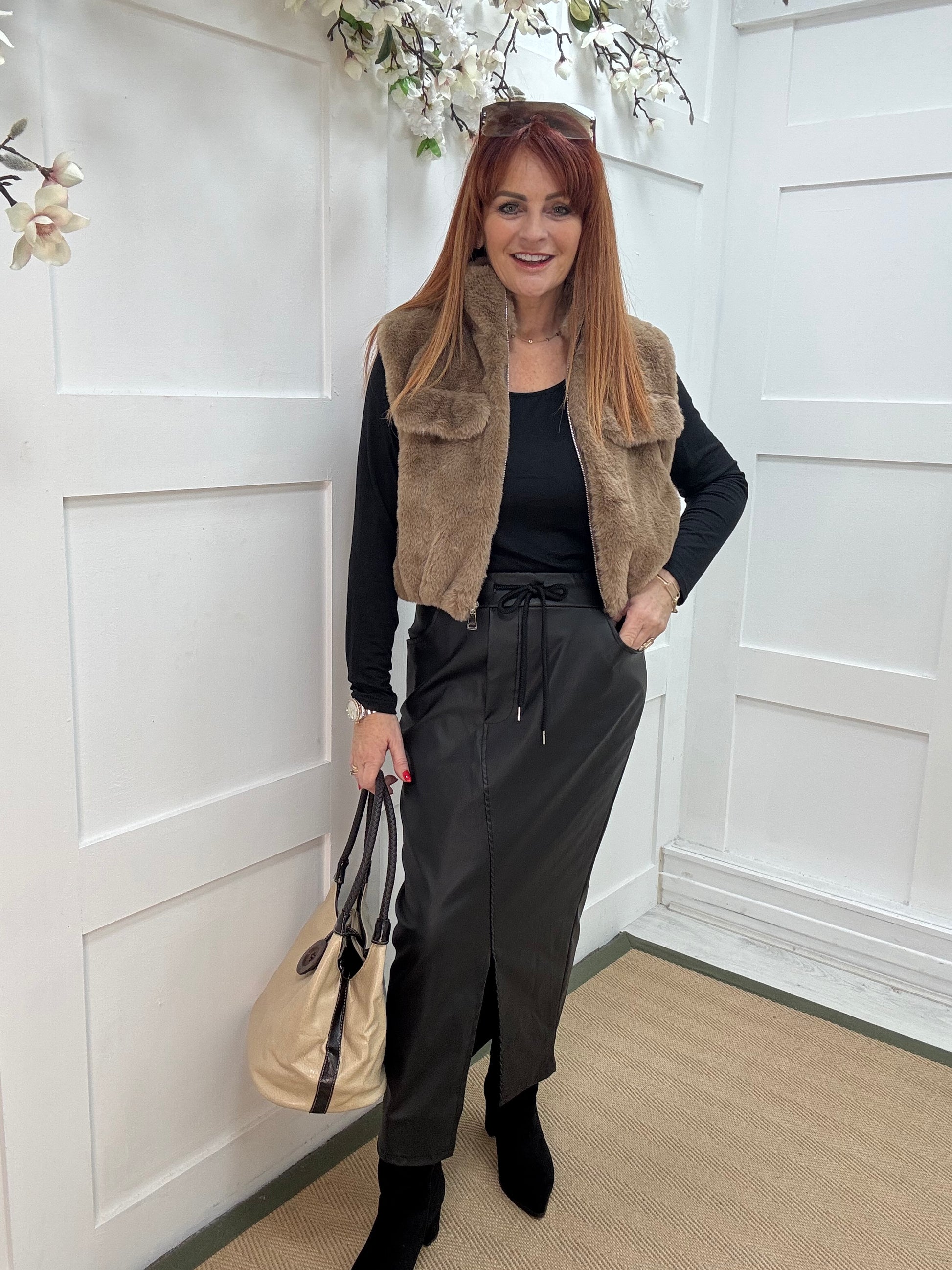 Effie: Camel teddy bear faux fur gilet. One size 8-14