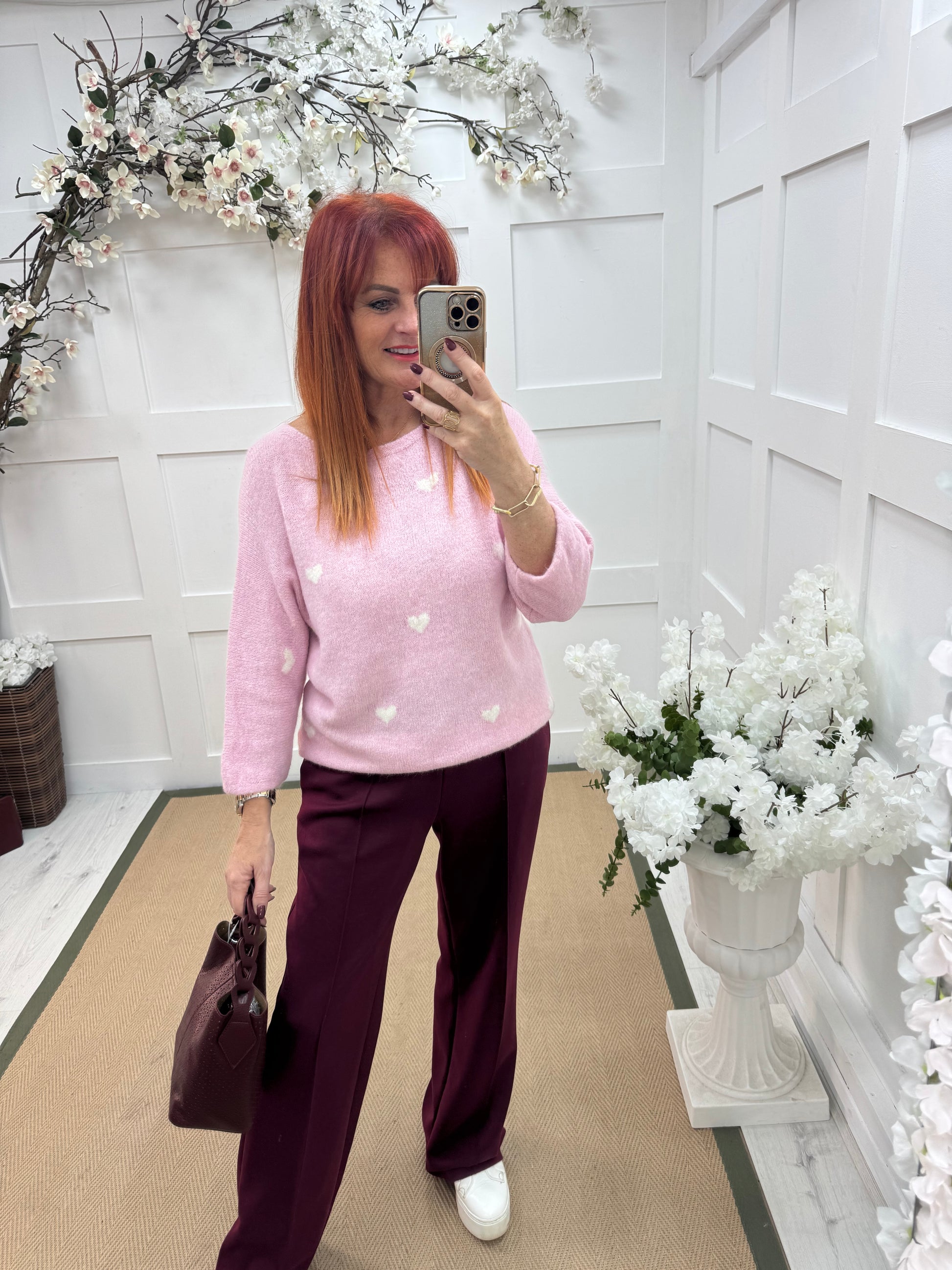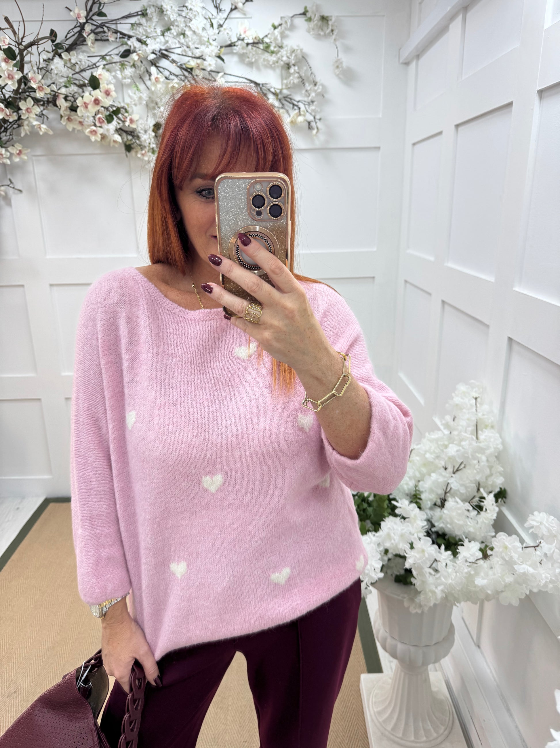 This soft pink jumper features a relaxed, flowy fit with a fuzzy, cozy texture. Scattered white heart motifs add a cute, playful touch. Its wide sleeves and lightweight knit make it perfect for layering, offering both comfort and sweetness for everyday wear.
