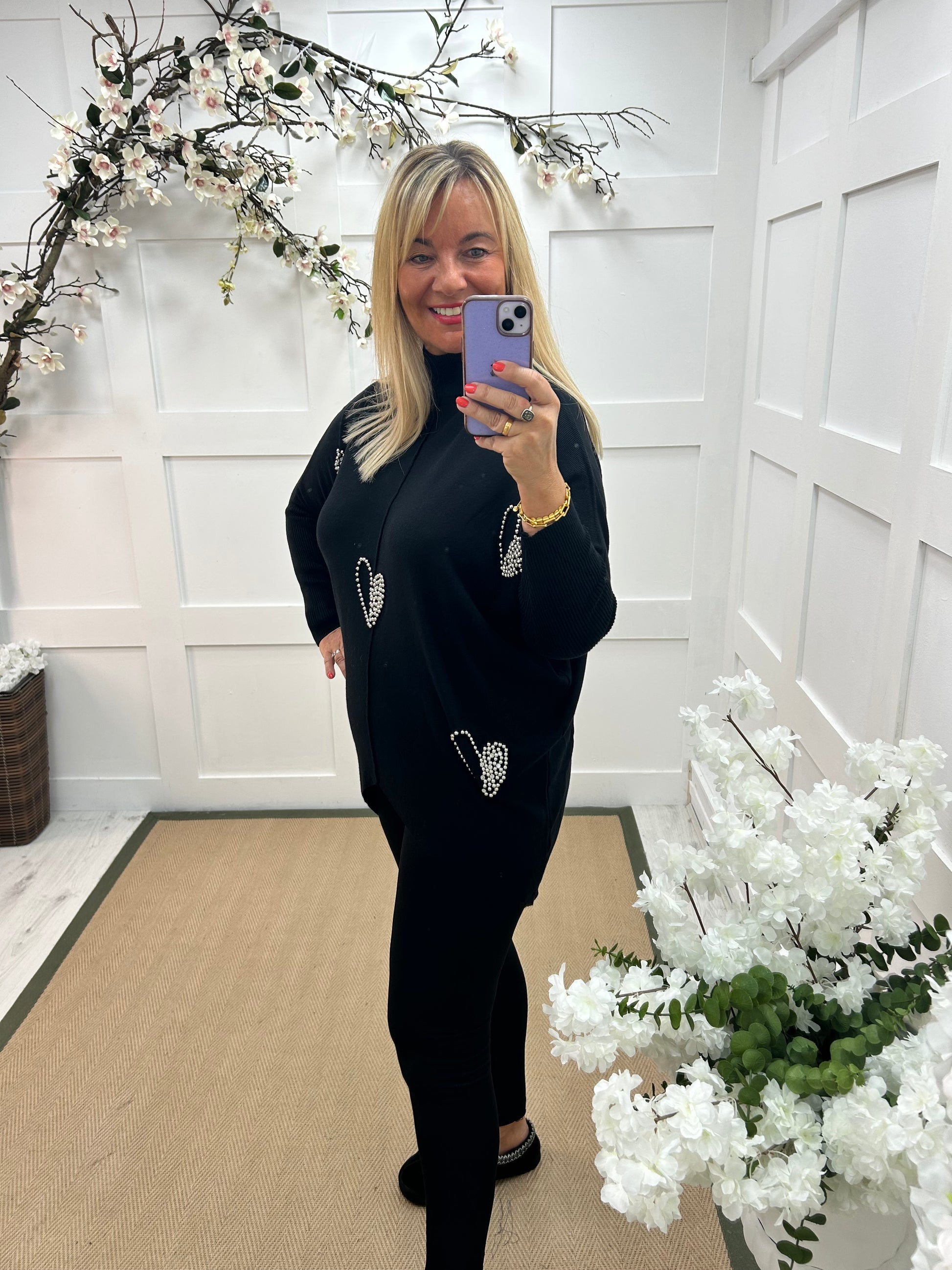 This stretchy knit top combines elegance with comfort, crafted in a soft Italian-inspired design. The longline silhouette flatters while allowing ease of movement. A cosy high neckline balances the relaxed fit, and shimmering embellished heart details add a playful yet chic touch. Perfect for pairing with leggings or slim trousers for effortless style.