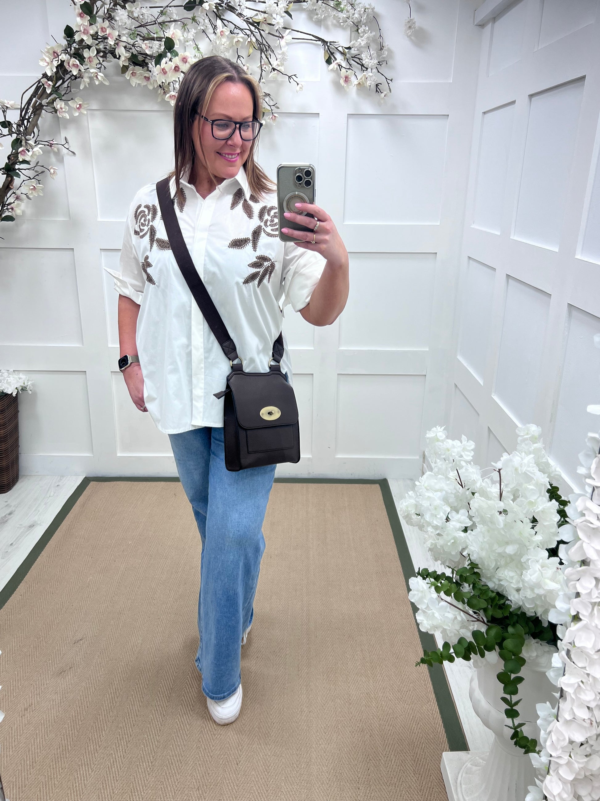 This elegant white shirt featuring delicate floral embroidery across the front for a refined, feminine touch. Designed with a classic collar, long sleeves, and a relaxed silhouette for effortless wear. Lightweight and versatile, it pairs beautifully with tailoring or denim. A timeless piece that elevates everyday outfits with subtle detail and charm.