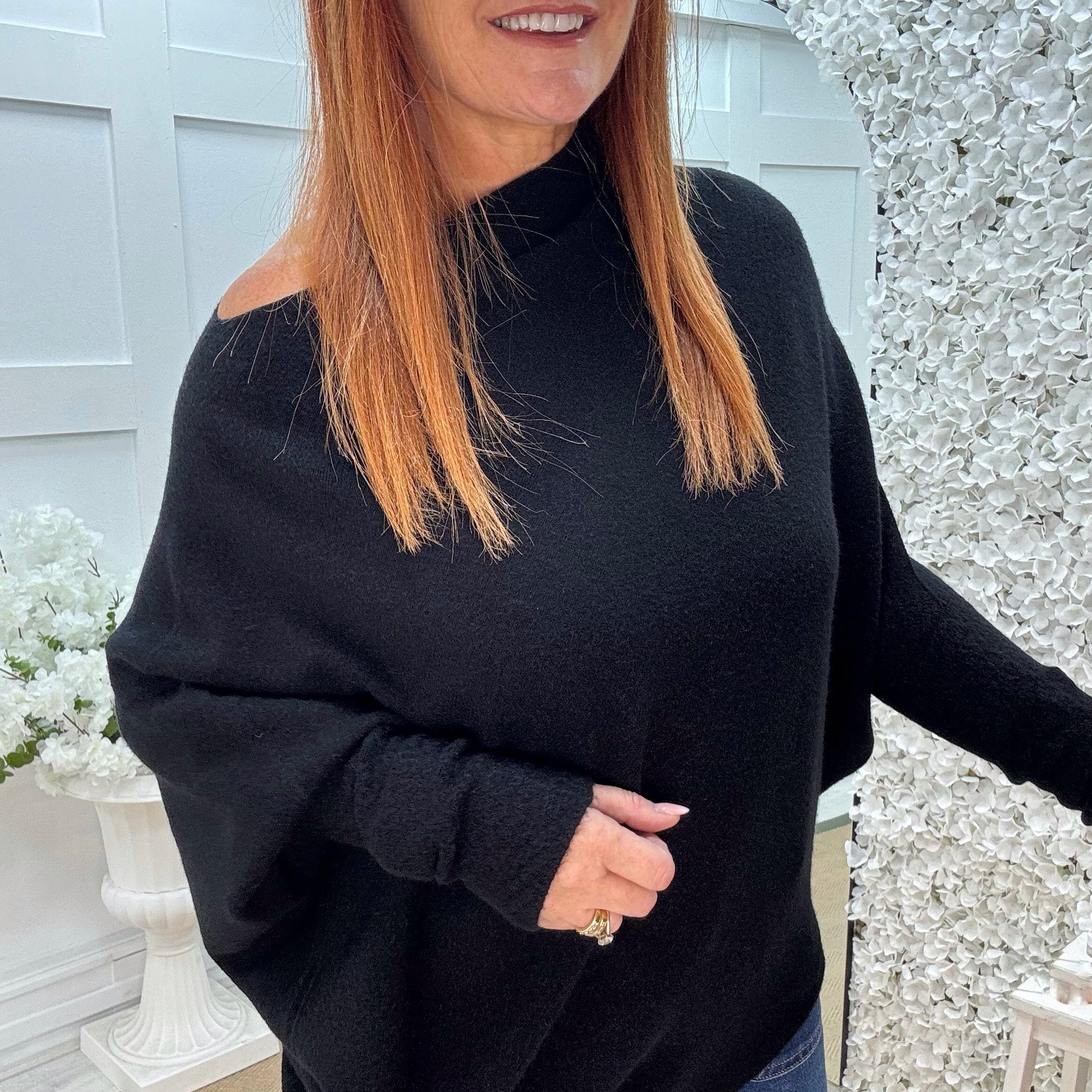 Erica: Black asymmetrical slouch soft knit top. One size 10-18